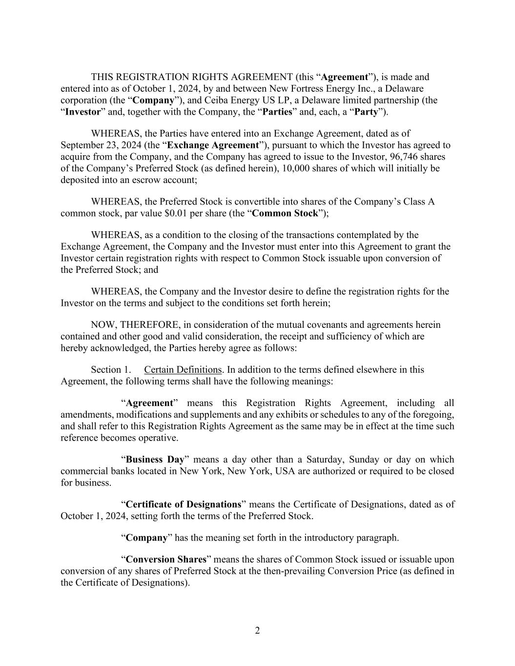 2 THIS REGISTRATION RIGHTS AGREEMENT (this “Agreement”), is made and entered into as of October 1, 2024, by and between New Fortress Energy Inc., a Delaware corporation (the “Company”), and Ceiba Energy US LP, a Delaware limited partnership (the “Investor” and, together with the Company, the “Parties” and, each, a “Party”). WHEREAS, the Parties have entered into an Exchange Agreement, dated as of September 23, 2024 (the “Exchange Agreement”), pursuant to which the Investor has agreed to acquire from the Company, and the Company has agreed to issue to the Investor, 96,746 shares of the Company’s Preferred Stock (as defined herein), 10,000 shares of which will initially be deposited into an escrow account; WHEREAS, the Preferred Stock is convertible into shares of the Company’s Class A common stock, par value $0.01 per share (the “Common Stock”); WHEREAS, as a condition to the closing of the transactions contemplated by the Exchange Agreement, the Company and the Investor must enter into this Agreement to grant the Investor certain registration rights with respect to Common Stock issuable upon conversion of the Preferred Stock; and WHEREAS, the Company and the Investor desire to define the registration rights for the Investor on the terms and subject to the conditions set forth herein; NOW, THEREFORE, in consideration of the mutual covenants and agreements herein contained and other good and valid consideration, the receipt and sufficiency of which are hereby acknowledged, the Parties hereby agree as follows: Section 1. Certain Definitions. In addition to the terms defined elsewhere in this Agreement, the following terms shall have the following meanings: “Agreement” means this Registration Rights Agreement, including all amendments, modifications and supplements and any exhibits or schedules to any of the foregoing, and shall refer to this Registration Rights Agreement as the same may be in effect at the time such reference becomes operative. “Business Day” means a day other than a Saturday, Sunday or day on which commercial banks located in New York, New York, USA are authorized or required to be closed for business. “Certificate of Designations” means the Certificate of Designations, dated as of October 1, 2024, setting forth the terms of the Preferred Stock. “Company” has the meaning set forth in the introductory paragraph. “Conversion Shares” means the shares of Common Stock issued or issuable upon conversion of any shares of Preferred Stock at the then-prevailing Conversion Price (as defined in the Certificate of Designations).