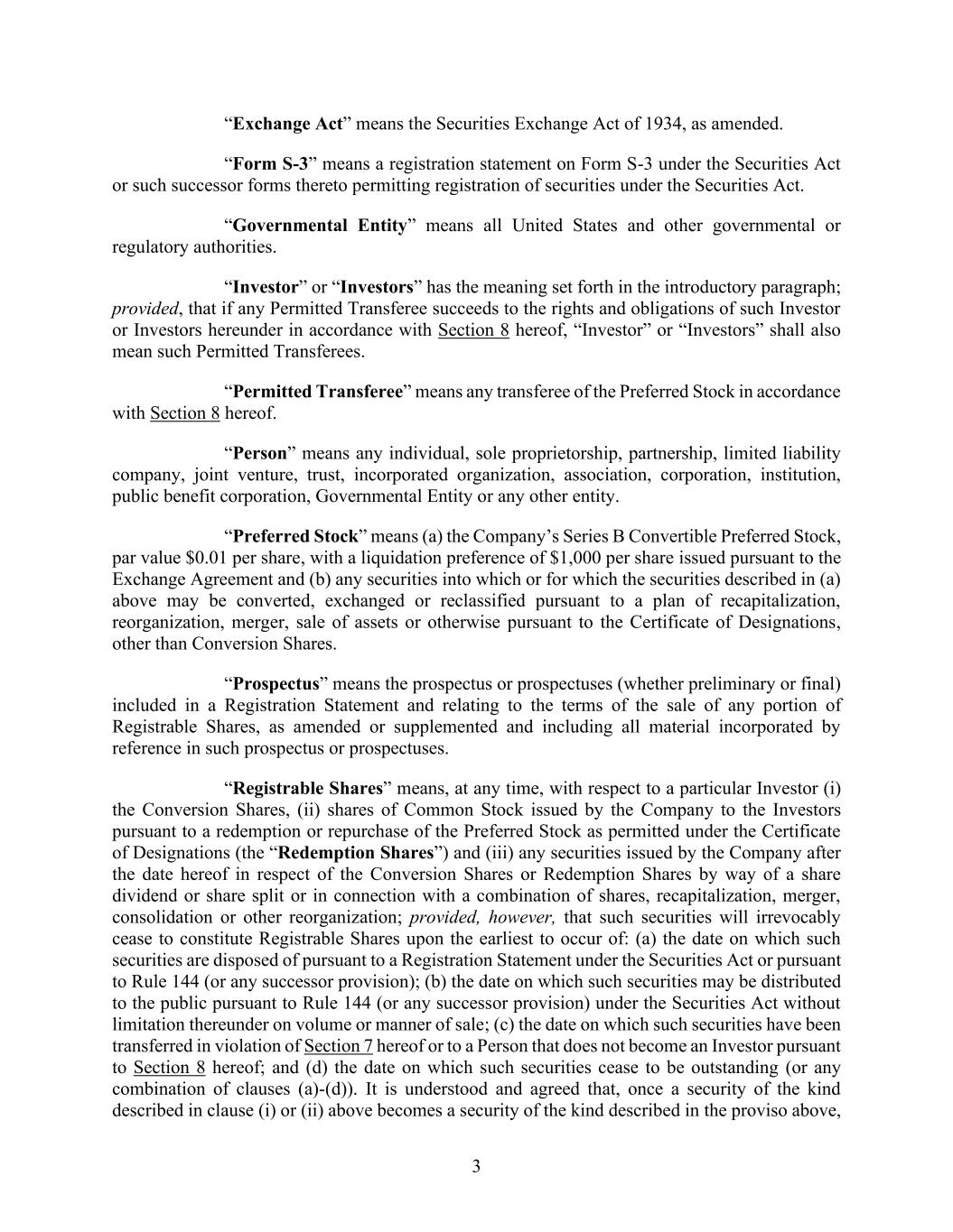 3 “Exchange Act” means the Securities Exchange Act of 1934, as amended. “Form S-3” means a registration statement on Form S-3 under the Securities Act or such successor forms thereto permitting registration of securities under the Securities Act. “Governmental Entity” means all United States and other governmental or regulatory authorities. “Investor” or “Investors” has the meaning set forth in the introductory paragraph; provided, that if any Permitted Transferee succeeds to the rights and obligations of such Investor or Investors hereunder in accordance with Section 8 hereof, “Investor” or “Investors” shall also mean such Permitted Transferees. “Permitted Transferee” means any transferee of the Preferred Stock in accordance with Section 8 hereof. “Person” means any individual, sole proprietorship, partnership, limited liability company, joint venture, trust, incorporated organization, association, corporation, institution, public benefit corporation, Governmental Entity or any other entity. “Preferred Stock” means (a) the Company’s Series B Convertible Preferred Stock, par value $0.01 per share, with a liquidation preference of $1,000 per share issued pursuant to the Exchange Agreement and (b) any securities into which or for which the securities described in (a) above may be converted, exchanged or reclassified pursuant to a plan of recapitalization, reorganization, merger, sale of assets or otherwise pursuant to the Certificate of Designations, other than Conversion Shares. “Prospectus” means the prospectus or prospectuses (whether preliminary or final) included in a Registration Statement and relating to the terms of the sale of any portion of Registrable Shares, as amended or supplemented and including all material incorporated by reference in such prospectus or prospectuses. “Registrable Shares” means, at any time, with respect to a particular Investor (i) the Conversion Shares, (ii) shares of Common Stock issued by the Company to the Investors pursuant to a redemption or repurchase of the Preferred Stock as permitted under the Certificate of Designations (the “Redemption Shares”) and (iii) any securities issued by the Company after the date hereof in respect of the Conversion Shares or Redemption Shares by way of a share dividend or share split or in connection with a combination of shares, recapitalization, merger, consolidation or other reorganization; provided, however, that such securities will irrevocably cease to constitute Registrable Shares upon the earliest to occur of: (a) the date on which such securities are disposed of pursuant to a Registration Statement under the Securities Act or pursuant to Rule 144 (or any successor provision); (b) the date on which such securities may be distributed to the public pursuant to Rule 144 (or any successor provision) under the Securities Act without limitation thereunder on volume or manner of sale; (c) the date on which such securities have been transferred in violation of Section 7 hereof or to a Person that does not become an Investor pursuant to Section 8 hereof; and (d) the date on which such securities cease to be outstanding (or any combination of clauses (a)-(d)). It is understood and agreed that, once a security of the kind described in clause (i) or (ii) above becomes a security of the kind described in the proviso above,
