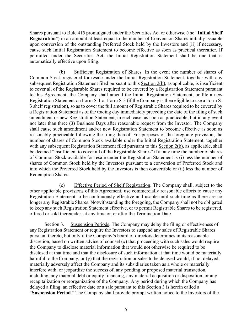 5 Shares pursuant to Rule 415 promulgated under the Securities Act or otherwise (the “Initial Shelf Registration”) in an amount at least equal to the number of Conversion Shares initially issuable upon conversion of the outstanding Preferred Stock held by the Investors and (ii) if necessary, cause such Initial Registration Statement to become effective as soon as practical thereafter. If permitted under the Securities Act, the Initial Registration Statement shall be one that is automatically effective upon filing. (b) Sufficient Registration of Shares. In the event the number of shares of Common Stock registered for resale under the Initial Registration Statement, together with any subsequent Registration Statement filed pursuant to this Section 2(b), as applicable, is insufficient to cover all of the Registrable Shares required to be covered by a Registration Statement pursuant to this Agreement, the Company shall amend the Initial Registration Statement, or file a new Registration Statement on Form S-1 or Form S-3 (if the Company is then eligible to use a Form S- 3 shelf registration), so as to cover the full amount of Registrable Shares required to be covered by a Registration Statement as of the trading day immediately preceding the date of the filing of such amendment or new Registration Statement, in each case, as soon as practicable, but in any event not later than three (3) Business Days after reasonable request from the Investor. The Company shall cause such amendment and/or new Registration Statement to become effective as soon as reasonably practicable following the filing thereof. For purposes of the foregoing provision, the number of shares of Common Stock available under the Initial Registration Statement, together with any subsequent Registration Statement filed pursuant to this Section 2(b), as applicable, shall be deemed “insufficient to cover all of the Registrable Shares” if at any time the number of shares of Common Stock available for resale under the Registration Statement is (i) less the number of shares of Common Stock held by the Investors pursuant to a conversion of Preferred Stock and into which the Preferred Stock held by the Investors is then convertible or (ii) less the number of Redemption Shares. (c) Effective Period of Shelf Registration. The Company shall, subject to the other applicable provisions of this Agreement, use commercially reasonable efforts to cause any Registration Statement to be continuously effective and usable until such time as there are no longer any Registrable Shares. Notwithstanding the foregoing, the Company shall not be obligated to keep any such Registration Statement effective, or to permit Registrable Shares to be registered, offered or sold thereunder, at any time on or after the Termination Date. Section 3. Suspension Periods. The Company may delay the filing or effectiveness of any Registration Statement or require the Investors to suspend any sales of Registrable Shares pursuant thereto, but only if the Company’s board of directors determines in its reasonable discretion, based on written advice of counsel (x) that proceeding with such sales would require the Company to disclose material information that would not otherwise be required to be disclosed at that time and that the disclosure of such information at that time would be materially harmful to the Company, or (y) that the registration or sales to be delayed would, if not delayed, materially adversely affect the Company and its subsidiaries taken as a whole or materially interfere with, or jeopardize the success of, any pending or proposed material transaction, including, any material debt or equity financing, any material acquisition or disposition, or any recapitalization or reorganization of the Company. Any period during which the Company has delayed a filing, an effective date or a sale pursuant to this Section 3 is herein called a “Suspension Period.” The Company shall provide prompt written notice to the Investors of the