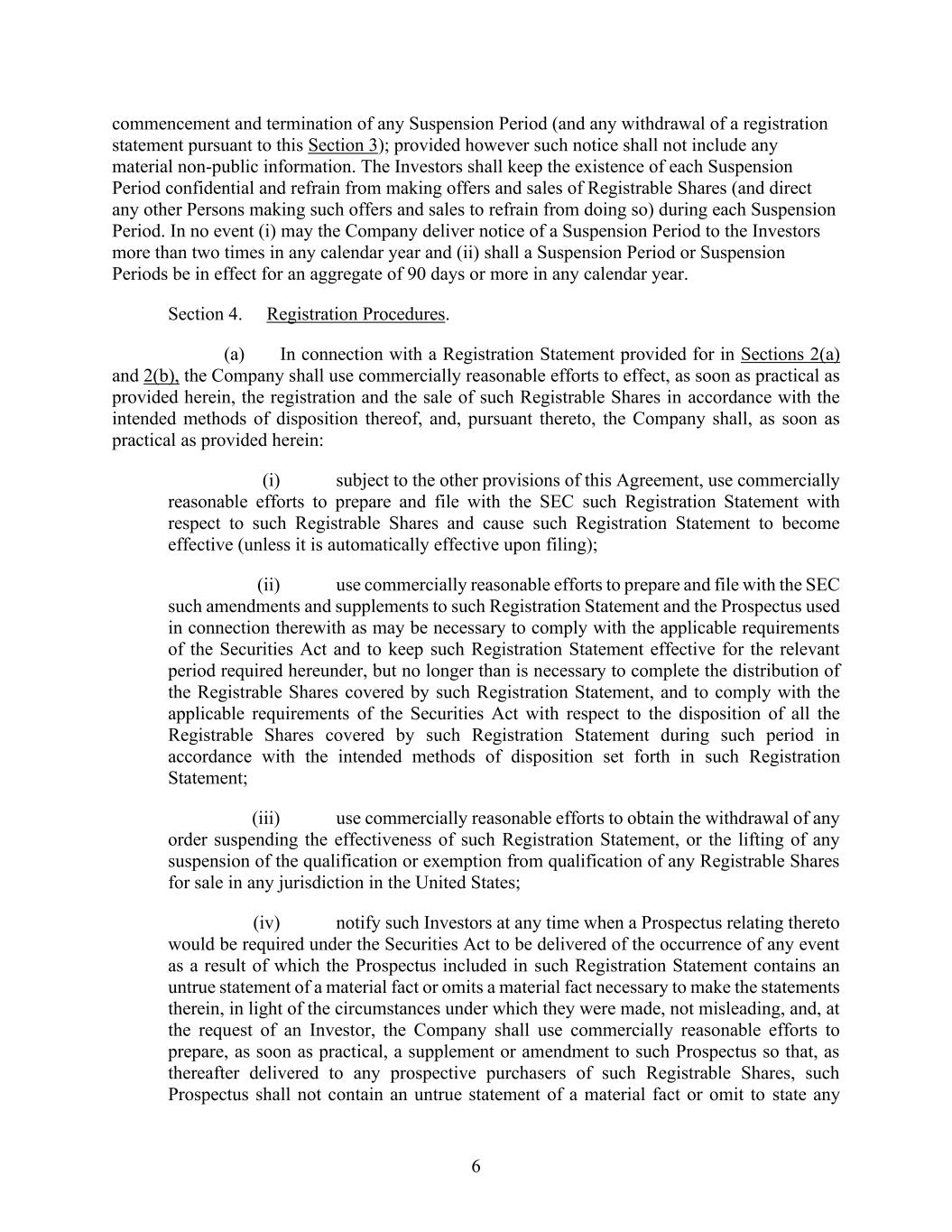 6 commencement and termination of any Suspension Period (and any withdrawal of a registration statement pursuant to this Section 3); provided however such notice shall not include any material non-public information. The Investors shall keep the existence of each Suspension Period confidential and refrain from making offers and sales of Registrable Shares (and direct any other Persons making such offers and sales to refrain from doing so) during each Suspension Period. In no event (i) may the Company deliver notice of a Suspension Period to the Investors more than two times in any calendar year and (ii) shall a Suspension Period or Suspension Periods be in effect for an aggregate of 90 days or more in any calendar year. Section 4. Registration Procedures. (a) In connection with a Registration Statement provided for in Sections 2(a) and 2(b), the Company shall use commercially reasonable efforts to effect, as soon as practical as provided herein, the registration and the sale of such Registrable Shares in accordance with the intended methods of disposition thereof, and, pursuant thereto, the Company shall, as soon as practical as provided herein: (i) subject to the other provisions of this Agreement, use commercially reasonable efforts to prepare and file with the SEC such Registration Statement with respect to such Registrable Shares and cause such Registration Statement to become effective (unless it is automatically effective upon filing); (ii) use commercially reasonable efforts to prepare and file with the SEC such amendments and supplements to such Registration Statement and the Prospectus used in connection therewith as may be necessary to comply with the applicable requirements of the Securities Act and to keep such Registration Statement effective for the relevant period required hereunder, but no longer than is necessary to complete the distribution of the Registrable Shares covered by such Registration Statement, and to comply with the applicable requirements of the Securities Act with respect to the disposition of all the Registrable Shares covered by such Registration Statement during such period in accordance with the intended methods of disposition set forth in such Registration Statement; (iii) use commercially reasonable efforts to obtain the withdrawal of any order suspending the effectiveness of such Registration Statement, or the lifting of any suspension of the qualification or exemption from qualification of any Registrable Shares for sale in any jurisdiction in the United States; (iv) notify such Investors at any time when a Prospectus relating thereto would be required under the Securities Act to be delivered of the occurrence of any event as a result of which the Prospectus included in such Registration Statement contains an untrue statement of a material fact or omits a material fact necessary to make the statements therein, in light of the circumstances under which they were made, not misleading, and, at the request of an Investor, the Company shall use commercially reasonable efforts to prepare, as soon as practical, a supplement or amendment to such Prospectus so that, as thereafter delivered to any prospective purchasers of such Registrable Shares, such Prospectus shall not contain an untrue statement of a material fact or omit to state any