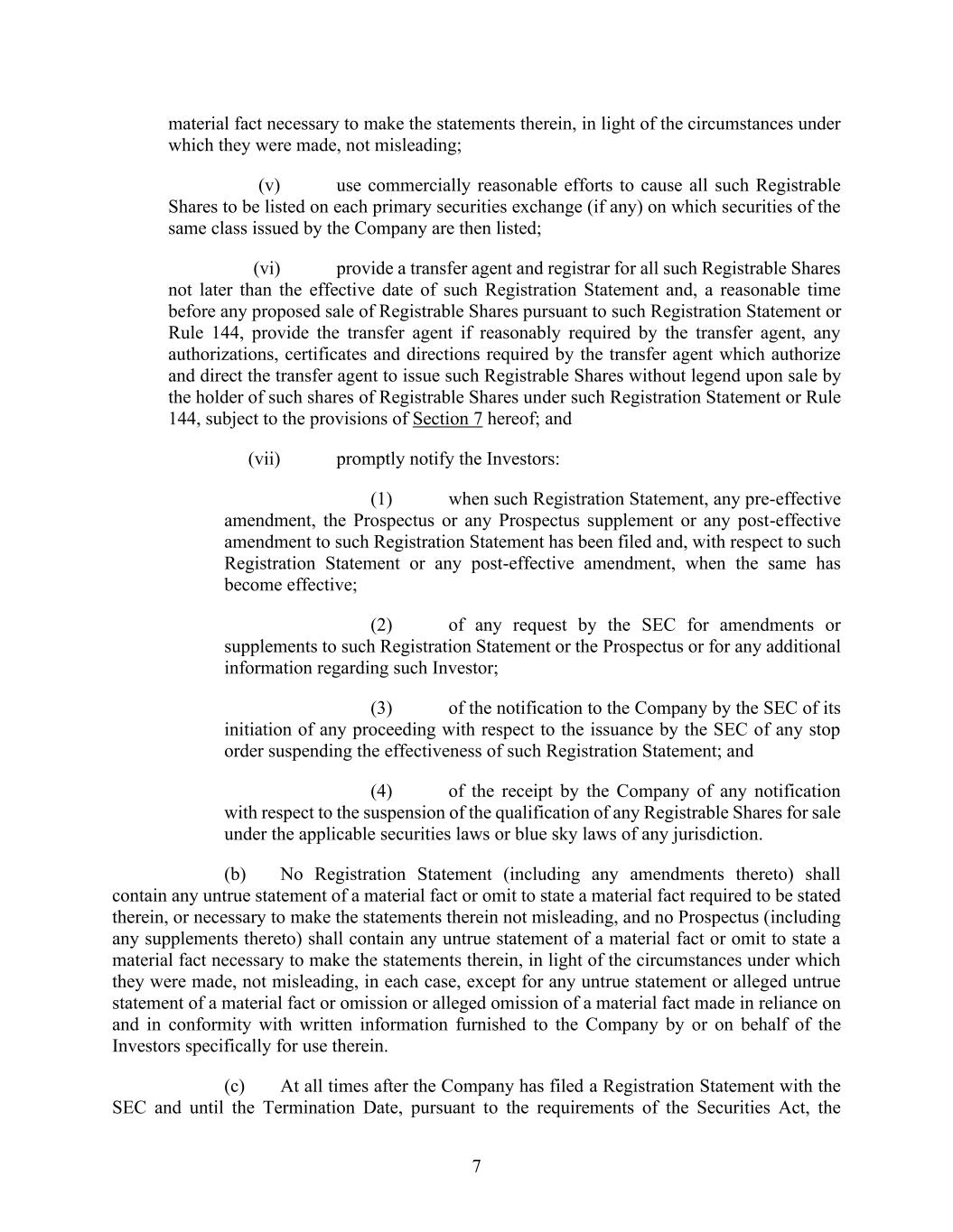7 material fact necessary to make the statements therein, in light of the circumstances under which they were made, not misleading; (v) use commercially reasonable efforts to cause all such Registrable Shares to be listed on each primary securities exchange (if any) on which securities of the same class issued by the Company are then listed; (vi) provide a transfer agent and registrar for all such Registrable Shares not later than the effective date of such Registration Statement and, a reasonable time before any proposed sale of Registrable Shares pursuant to such Registration Statement or Rule 144, provide the transfer agent if reasonably required by the transfer agent, any authorizations, certificates and directions required by the transfer agent which authorize and direct the transfer agent to issue such Registrable Shares without legend upon sale by the holder of such shares of Registrable Shares under such Registration Statement or Rule 144, subject to the provisions of Section 7 hereof; and (vii) promptly notify the Investors: (1) when such Registration Statement, any pre-effective amendment, the Prospectus or any Prospectus supplement or any post-effective amendment to such Registration Statement has been filed and, with respect to such Registration Statement or any post-effective amendment, when the same has become effective; (2) of any request by the SEC for amendments or supplements to such Registration Statement or the Prospectus or for any additional information regarding such Investor; (3) of the notification to the Company by the SEC of its initiation of any proceeding with respect to the issuance by the SEC of any stop order suspending the effectiveness of such Registration Statement; and (4) of the receipt by the Company of any notification with respect to the suspension of the qualification of any Registrable Shares for sale under the applicable securities laws or blue sky laws of any jurisdiction. (b) No Registration Statement (including any amendments thereto) shall contain any untrue statement of a material fact or omit to state a material fact required to be stated therein, or necessary to make the statements therein not misleading, and no Prospectus (including any supplements thereto) shall contain any untrue statement of a material fact or omit to state a material fact necessary to make the statements therein, in light of the circumstances under which they were made, not misleading, in each case, except for any untrue statement or alleged untrue statement of a material fact or omission or alleged omission of a material fact made in reliance on and in conformity with written information furnished to the Company by or on behalf of the Investors specifically for use therein. (c) At all times after the Company has filed a Registration Statement with the SEC and until the Termination Date, pursuant to the requirements of the Securities Act, the