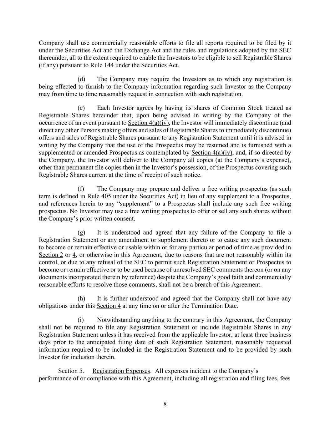 8 Company shall use commercially reasonable efforts to file all reports required to be filed by it under the Securities Act and the Exchange Act and the rules and regulations adopted by the SEC thereunder, all to the extent required to enable the Investors to be eligible to sell Registrable Shares (if any) pursuant to Rule 144 under the Securities Act. (d) The Company may require the Investors as to which any registration is being effected to furnish to the Company information regarding such Investor as the Company may from time to time reasonably request in connection with such registration. (e) Each Investor agrees by having its shares of Common Stock treated as Registrable Shares hereunder that, upon being advised in writing by the Company of the occurrence of an event pursuant to Section 4(a)(iv), the Investor will immediately discontinue (and direct any other Persons making offers and sales of Registrable Shares to immediately discontinue) offers and sales of Registrable Shares pursuant to any Registration Statement until it is advised in writing by the Company that the use of the Prospectus may be resumed and is furnished with a supplemented or amended Prospectus as contemplated by Section 4(a)(iv), and, if so directed by the Company, the Investor will deliver to the Company all copies (at the Company’s expense), other than permanent file copies then in the Investor’s possession, of the Prospectus covering such Registrable Shares current at the time of receipt of such notice. (f) The Company may prepare and deliver a free writing prospectus (as such term is defined in Rule 405 under the Securities Act) in lieu of any supplement to a Prospectus, and references herein to any “supplement” to a Prospectus shall include any such free writing prospectus. No Investor may use a free writing prospectus to offer or sell any such shares without the Company’s prior written consent. (g) It is understood and agreed that any failure of the Company to file a Registration Statement or any amendment or supplement thereto or to cause any such document to become or remain effective or usable within or for any particular period of time as provided in Section 2 or 4, or otherwise in this Agreement, due to reasons that are not reasonably within its control, or due to any refusal of the SEC to permit such Registration Statement or Prospectus to become or remain effective or to be used because of unresolved SEC comments thereon (or on any documents incorporated therein by reference) despite the Company’s good faith and commercially reasonable efforts to resolve those comments, shall not be a breach of this Agreement. (h) It is further understood and agreed that the Company shall not have any obligations under this Section 4 at any time on or after the Termination Date. (i) Notwithstanding anything to the contrary in this Agreement, the Company shall not be required to file any Registration Statement or include Registrable Shares in any Registration Statement unless it has received from the applicable Investor, at least three business days prior to the anticipated filing date of such Registration Statement, reasonably requested information required to be included in the Registration Statement and to be provided by such Investor for inclusion therein. Section 5. Registration Expenses. All expenses incident to the Company’s performance of or compliance with this Agreement, including all registration and filing fees, fees