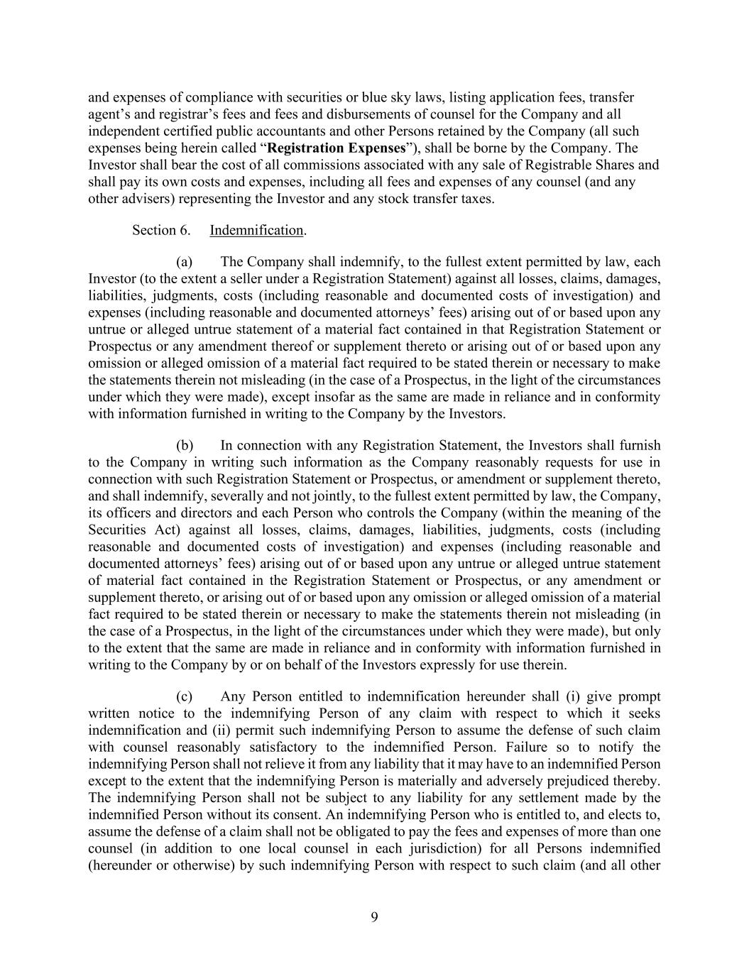 9 and expenses of compliance with securities or blue sky laws, listing application fees, transfer agent’s and registrar’s fees and fees and disbursements of counsel for the Company and all independent certified public accountants and other Persons retained by the Company (all such expenses being herein called “Registration Expenses”), shall be borne by the Company. The Investor shall bear the cost of all commissions associated with any sale of Registrable Shares and shall pay its own costs and expenses, including all fees and expenses of any counsel (and any other advisers) representing the Investor and any stock transfer taxes. Section 6. Indemnification. (a) The Company shall indemnify, to the fullest extent permitted by law, each Investor (to the extent a seller under a Registration Statement) against all losses, claims, damages, liabilities, judgments, costs (including reasonable and documented costs of investigation) and expenses (including reasonable and documented attorneys’ fees) arising out of or based upon any untrue or alleged untrue statement of a material fact contained in that Registration Statement or Prospectus or any amendment thereof or supplement thereto or arising out of or based upon any omission or alleged omission of a material fact required to be stated therein or necessary to make the statements therein not misleading (in the case of a Prospectus, in the light of the circumstances under which they were made), except insofar as the same are made in reliance and in conformity with information furnished in writing to the Company by the Investors. (b) In connection with any Registration Statement, the Investors shall furnish to the Company in writing such information as the Company reasonably requests for use in connection with such Registration Statement or Prospectus, or amendment or supplement thereto, and shall indemnify, severally and not jointly, to the fullest extent permitted by law, the Company, its officers and directors and each Person who controls the Company (within the meaning of the Securities Act) against all losses, claims, damages, liabilities, judgments, costs (including reasonable and documented costs of investigation) and expenses (including reasonable and documented attorneys’ fees) arising out of or based upon any untrue or alleged untrue statement of material fact contained in the Registration Statement or Prospectus, or any amendment or supplement thereto, or arising out of or based upon any omission or alleged omission of a material fact required to be stated therein or necessary to make the statements therein not misleading (in the case of a Prospectus, in the light of the circumstances under which they were made), but only to the extent that the same are made in reliance and in conformity with information furnished in writing to the Company by or on behalf of the Investors expressly for use therein. (c) Any Person entitled to indemnification hereunder shall (i) give prompt written notice to the indemnifying Person of any claim with respect to which it seeks indemnification and (ii) permit such indemnifying Person to assume the defense of such claim with counsel reasonably satisfactory to the indemnified Person. Failure so to notify the indemnifying Person shall not relieve it from any liability that it may have to an indemnified Person except to the extent that the indemnifying Person is materially and adversely prejudiced thereby. The indemnifying Person shall not be subject to any liability for any settlement made by the indemnified Person without its consent. An indemnifying Person who is entitled to, and elects to, assume the defense of a claim shall not be obligated to pay the fees and expenses of more than one counsel (in addition to one local counsel in each jurisdiction) for all Persons indemnified (hereunder or otherwise) by such indemnifying Person with respect to such claim (and all other