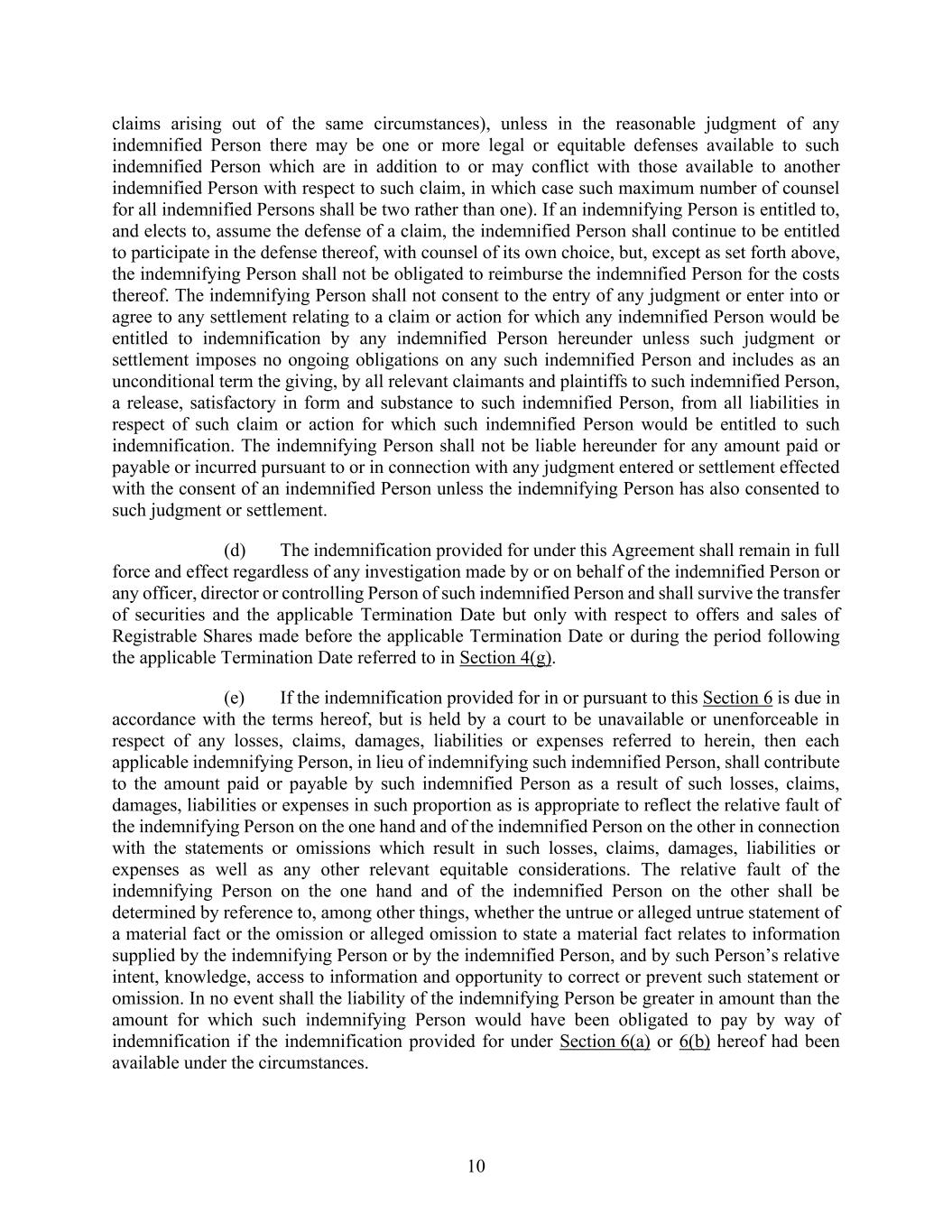 10 claims arising out of the same circumstances), unless in the reasonable judgment of any indemnified Person there may be one or more legal or equitable defenses available to such indemnified Person which are in addition to or may conflict with those available to another indemnified Person with respect to such claim, in which case such maximum number of counsel for all indemnified Persons shall be two rather than one). If an indemnifying Person is entitled to, and elects to, assume the defense of a claim, the indemnified Person shall continue to be entitled to participate in the defense thereof, with counsel of its own choice, but, except as set forth above, the indemnifying Person shall not be obligated to reimburse the indemnified Person for the costs thereof. The indemnifying Person shall not consent to the entry of any judgment or enter into or agree to any settlement relating to a claim or action for which any indemnified Person would be entitled to indemnification by any indemnified Person hereunder unless such judgment or settlement imposes no ongoing obligations on any such indemnified Person and includes as an unconditional term the giving, by all relevant claimants and plaintiffs to such indemnified Person, a release, satisfactory in form and substance to such indemnified Person, from all liabilities in respect of such claim or action for which such indemnified Person would be entitled to such indemnification. The indemnifying Person shall not be liable hereunder for any amount paid or payable or incurred pursuant to or in connection with any judgment entered or settlement effected with the consent of an indemnified Person unless the indemnifying Person has also consented to such judgment or settlement. (d) The indemnification provided for under this Agreement shall remain in full force and effect regardless of any investigation made by or on behalf of the indemnified Person or any officer, director or controlling Person of such indemnified Person and shall survive the transfer of securities and the applicable Termination Date but only with respect to offers and sales of Registrable Shares made before the applicable Termination Date or during the period following the applicable Termination Date referred to in Section 4(g). (e) If the indemnification provided for in or pursuant to this Section 6 is due in accordance with the terms hereof, but is held by a court to be unavailable or unenforceable in respect of any losses, claims, damages, liabilities or expenses referred to herein, then each applicable indemnifying Person, in lieu of indemnifying such indemnified Person, shall contribute to the amount paid or payable by such indemnified Person as a result of such losses, claims, damages, liabilities or expenses in such proportion as is appropriate to reflect the relative fault of the indemnifying Person on the one hand and of the indemnified Person on the other in connection with the statements or omissions which result in such losses, claims, damages, liabilities or expenses as well as any other relevant equitable considerations. The relative fault of the indemnifying Person on the one hand and of the indemnified Person on the other shall be determined by reference to, among other things, whether the untrue or alleged untrue statement of a material fact or the omission or alleged omission to state a material fact relates to information supplied by the indemnifying Person or by the indemnified Person, and by such Person’s relative intent, knowledge, access to information and opportunity to correct or prevent such statement or omission. In no event shall the liability of the indemnifying Person be greater in amount than the amount for which such indemnifying Person would have been obligated to pay by way of indemnification if the indemnification provided for under Section 6(a) or 6(b) hereof had been available under the circumstances.