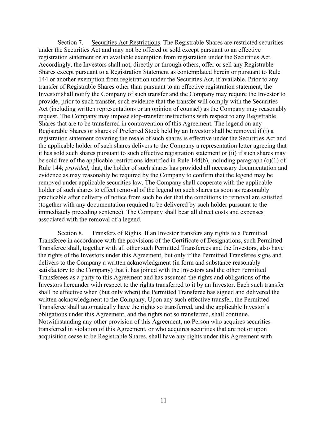 11 Section 7. Securities Act Restrictions. The Registrable Shares are restricted securities under the Securities Act and may not be offered or sold except pursuant to an effective registration statement or an available exemption from registration under the Securities Act. Accordingly, the Investors shall not, directly or through others, offer or sell any Registrable Shares except pursuant to a Registration Statement as contemplated herein or pursuant to Rule 144 or another exemption from registration under the Securities Act, if available. Prior to any transfer of Registrable Shares other than pursuant to an effective registration statement, the Investor shall notify the Company of such transfer and the Company may require the Investor to provide, prior to such transfer, such evidence that the transfer will comply with the Securities Act (including written representations or an opinion of counsel) as the Company may reasonably request. The Company may impose stop-transfer instructions with respect to any Registrable Shares that are to be transferred in contravention of this Agreement. The legend on any Registrable Shares or shares of Preferred Stock held by an Investor shall be removed if (i) a registration statement covering the resale of such shares is effective under the Securities Act and the applicable holder of such shares delivers to the Company a representation letter agreeing that it has sold such shares pursuant to such effective registration statement or (ii) if such shares may be sold free of the applicable restrictions identified in Rule 144(b), including paragraph (c)(1) of Rule 144; provided, that, the holder of such shares has provided all necessary documentation and evidence as may reasonably be required by the Company to confirm that the legend may be removed under applicable securities law. The Company shall cooperate with the applicable holder of such shares to effect removal of the legend on such shares as soon as reasonably practicable after delivery of notice from such holder that the conditions to removal are satisfied (together with any documentation required to be delivered by such holder pursuant to the immediately preceding sentence). The Company shall bear all direct costs and expenses associated with the removal of a legend. Section 8. Transfers of Rights. If an Investor transfers any rights to a Permitted Transferee in accordance with the provisions of the Certificate of Designations, such Permitted Transferee shall, together with all other such Permitted Transferees and the Investors, also have the rights of the Investors under this Agreement, but only if the Permitted Transferee signs and delivers to the Company a written acknowledgment (in form and substance reasonably satisfactory to the Company) that it has joined with the Investors and the other Permitted Transferees as a party to this Agreement and has assumed the rights and obligations of the Investors hereunder with respect to the rights transferred to it by an Investor. Each such transfer shall be effective when (but only when) the Permitted Transferee has signed and delivered the written acknowledgment to the Company. Upon any such effective transfer, the Permitted Transferee shall automatically have the rights so transferred, and the applicable Investor’s obligations under this Agreement, and the rights not so transferred, shall continue. Notwithstanding any other provision of this Agreement, no Person who acquires securities transferred in violation of this Agreement, or who acquires securities that are not or upon acquisition cease to be Registrable Shares, shall have any rights under this Agreement with