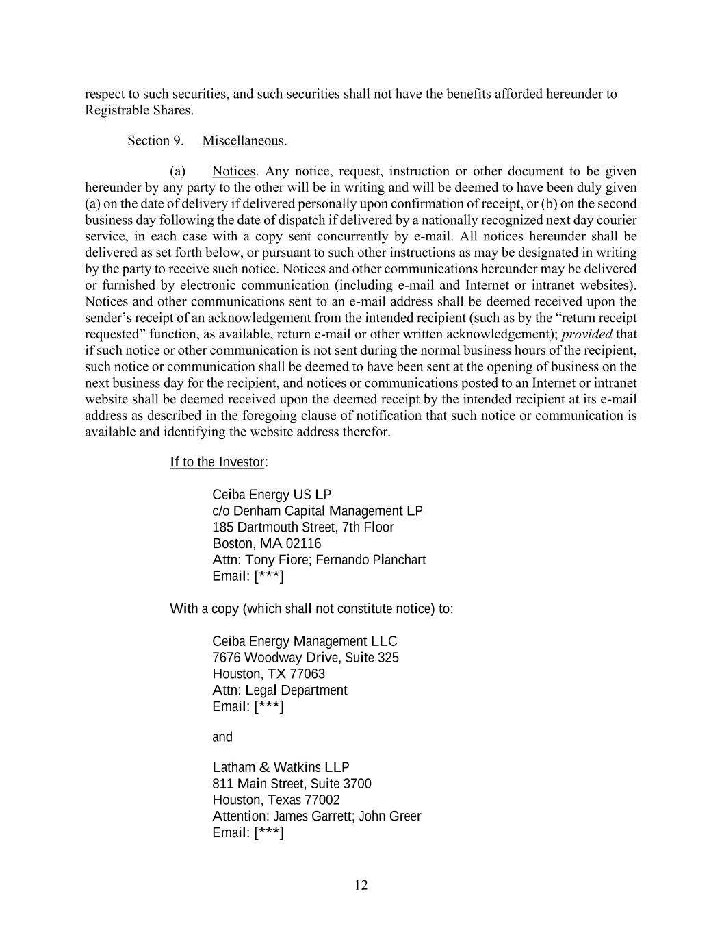 12 respect to such securities, and such securities shall not have the benefits afforded hereunder to Registrable Shares. Section 9. Miscellaneous. (a) Notices. Any notice, request, instruction or other document to be given hereunder by any party to the other will be in writing and will be deemed to have been duly given (a) on the date of delivery if delivered personally upon confirmation of receipt, or (b) on the second business day following the date of dispatch if delivered by a nationally recognized next day courier service, in each case with a copy sent concurrently by e-mail. All notices hereunder shall be delivered as set forth below, or pursuant to such other instructions as may be designated in writing by the party to receive such notice. Notices and other communications hereunder may be delivered or furnished by electronic communication (including e-mail and Internet or intranet websites). Notices and other communications sent to an e-mail address shall be deemed received upon the sender’s receipt of an acknowledgement from the intended recipient (such as by the “return receipt requested” function, as available, return e-mail or other written acknowledgement); provided that if such notice or other communication is not sent during the normal business hours of the recipient, such notice or communication shall be deemed to have been sent at the opening of business on the next business day for the recipient, and notices or communications posted to an Internet or intranet website shall be deemed received upon the deemed receipt by the intended recipient at its e-mail address as described in the foregoing clause of notification that such notice or communication is available and identifying the website address therefor. If to the Investor: Ceiba Energy US LP c/o Denham Capital Management LP 185 Dartmouth Street, 7th Floor Boston, MA 02116 Attn: Tony Fiore; Fernando Planchart Email: [***] With a copy (which shall not constitute notice) to: Ceiba Energy Management LLC 7676 Woodway Drive, Suite 325 Houston, TX 77063 Attn: Legal Department Email: [***] and Latham & Watkins LLP 811 Main Street, Suite 3700 Houston, Texas 77002 Attention: James Garrett; John Greer Email: [***]