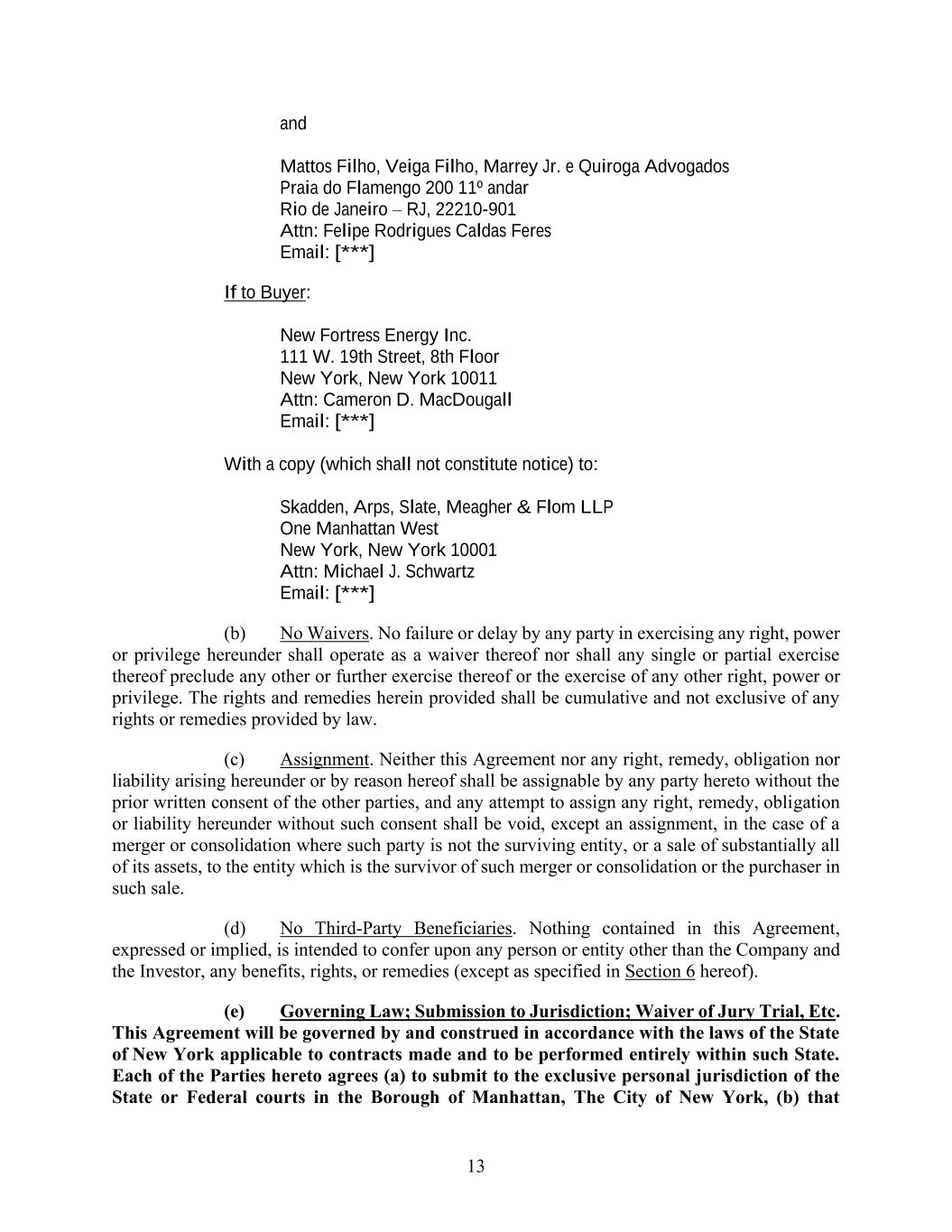 13 and Mattos Filho, Veiga Filho, Marrey Jr. e Quiroga Advogados Praia do Flamengo 200 11º andar Rio de Janeiro – RJ, 22210-901 Attn: Felipe Rodrigues Caldas Feres Email: [***] If to Buyer: New Fortress Energy Inc. 111 W. 19th Street, 8th Floor New York, New York 10011 Attn: Cameron D. MacDougall Email: [***] With a copy (which shall not constitute notice) to: Skadden, Arps, Slate, Meagher & Flom LLP One Manhattan West New York, New York 10001 Attn: Michael J. Schwartz Email: [***] (b) No Waivers. No failure or delay by any party in exercising any right, power or privilege hereunder shall operate as a waiver thereof nor shall any single or partial exercise thereof preclude any other or further exercise thereof or the exercise of any other right, power or privilege. The rights and remedies herein provided shall be cumulative and not exclusive of any rights or remedies provided by law. (c) Assignment. Neither this Agreement nor any right, remedy, obligation nor liability arising hereunder or by reason hereof shall be assignable by any party hereto without the prior written consent of the other parties, and any attempt to assign any right, remedy, obligation or liability hereunder without such consent shall be void, except an assignment, in the case of a merger or consolidation where such party is not the surviving entity, or a sale of substantially all of its assets, to the entity which is the survivor of such merger or consolidation or the purchaser in such sale. (d) No Third-Party Beneficiaries. Nothing contained in this Agreement, expressed or implied, is intended to confer upon any person or entity other than the Company and the Investor, any benefits, rights, or remedies (except as specified in Section 6 hereof). (e) Governing Law; Submission to Jurisdiction; Waiver of Jury Trial, Etc. This Agreement will be governed by and construed in accordance with the laws of the State of New York applicable to contracts made and to be performed entirely within such State. Each of the Parties hereto agrees (a) to submit to the exclusive personal jurisdiction of the State or Federal courts in the Borough of Manhattan, The City of New York, (b) that