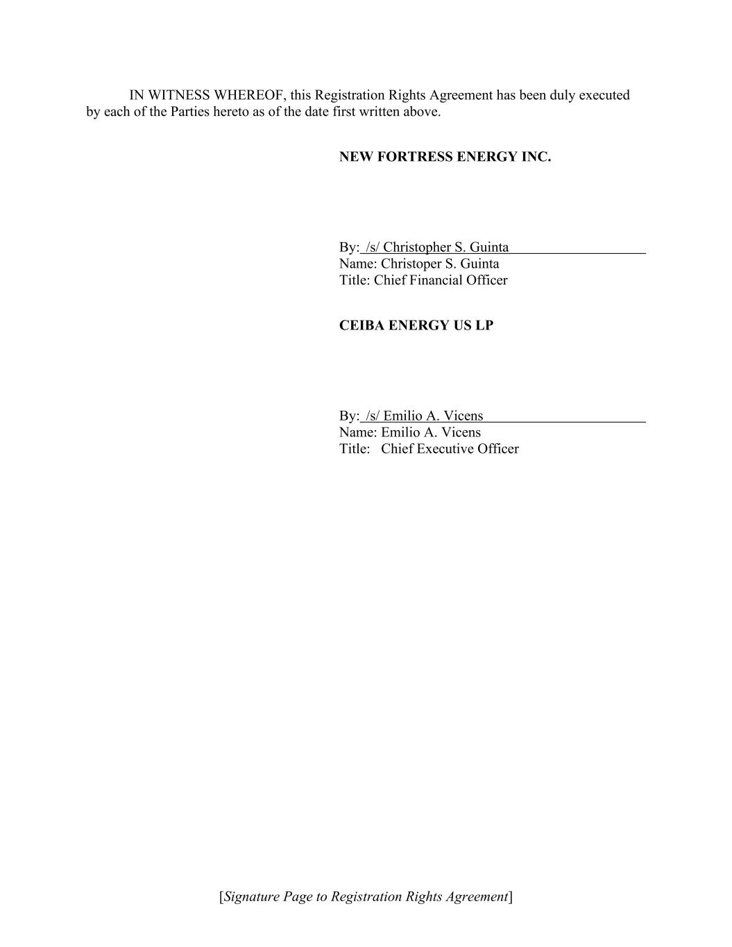 [Signature Page to Registration Rights Agreement] IN WITNESS WHEREOF, this Registration Rights Agreement has been duly executed by each of the Parties hereto as of the date first written above. NEW FORTRESS ENERGY INC. By: /s/ Christopher S. Guinta Name: Christoper S. Guinta Title: Chief Financial Officer CEIBA ENERGY US LP By: /s/ Emilio A. Vicens Name: Emilio A. Vicens Title: Chief Executive Officer