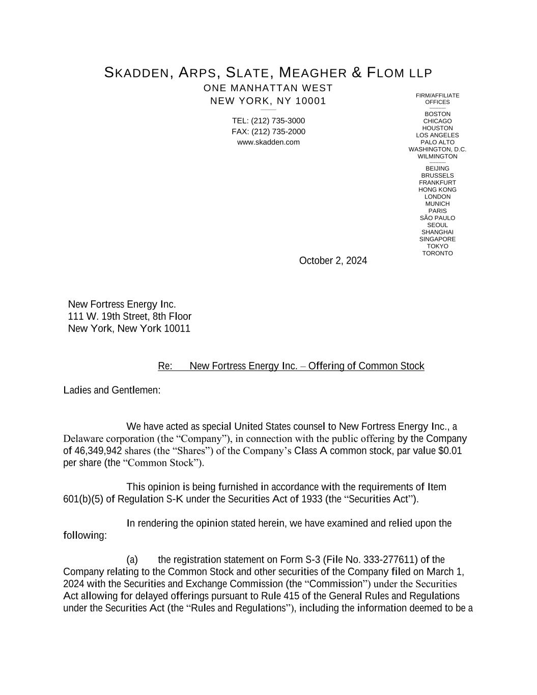 FIRM/AFFILIATE OFFICES ----------- BOSTON CHICAGO HOUSTON LOS ANGELES PALO ALTO WASHINGTON, D.C. WILMINGTON ----------- BEIJING BRUSSELS FRANKFURT HONG KONG LONDON MUNICH PARIS SÃO PAULO SEOUL SHANGHAI SINGAPORE TOKYO TORONTO SKADDEN, ARPS, SLATE, MEAGHER & FLOM LLP ONE MANHATTAN WEST NEW YORK, NY 10001 ________ TEL: (212) 735-3000 FAX: (212) 735-2000 www.skadden.com October 2, 2024 New Fortress Energy Inc. 111 W. 19th Street, 8th Floor New York, New York 10011 Re: New Fortress Energy Inc. – Offering of Common Stock Ladies and Gentlemen: We have acted as special United States counsel to New Fortress Energy Inc., a Delaware corporation (the “Company”), in connection with the public offering by the Company of 46,349,942 shares (the “Shares”) of the Company’s Class A common stock, par value $0.01 per share (the “Common Stock”). This opinion is being furnished in accordance with the requirements of Item 601(b)(5) of Regulation S-K under the Securities Act of 1933 (the “Securities Act”). In rendering the opinion stated herein, we have examined and relied upon the following: (a) the registration statement on Form S-3 (File No. 333-277611) of the Company relating to the Common Stock and other securities of the Company filed on March 1, 2024 with the Securities and Exchange Commission (the “Commission”) under the Securities Act allowing for delayed offerings pursuant to Rule 415 of the General Rules and Regulations under the Securities Act (the “Rules and Regulations”), including the information deemed to be a