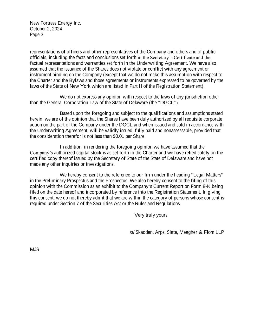 New Fortress Energy Inc. October 2, 2024 Page 3 representations of officers and other representatives of the Company and others and of public officials, including the facts and conclusions set forth in the Secretary’s Certificate and the factual representations and warranties set forth in the Underwriting Agreement. We have also assumed that the issuance of the Shares does not violate or conflict with any agreement or instrument binding on the Company (except that we do not make this assumption with respect to the Charter and the Bylaws and those agreements or instruments expressed to be governed by the laws of the State of New York which are listed in Part II of the Registration Statement). We do not express any opinion with respect to the laws of any jurisdiction other than the General Corporation Law of the State of Delaware (the “DGCL”). Based upon the foregoing and subject to the qualifications and assumptions stated herein, we are of the opinion that the Shares have been duly authorized by all requisite corporate action on the part of the Company under the DGCL and when issued and sold in accordance with the Underwriting Agreement, will be validly issued, fully paid and nonassessable, provided that the consideration therefor is not less than $0.01 per Share. In addition, in rendering the foregoing opinion we have assumed that the Company’s authorized capital stock is as set forth in the Charter and we have relied solely on the certified copy thereof issued by the Secretary of State of the State of Delaware and have not made any other inquiries or investigations. We hereby consent to the reference to our firm under the heading “Legal Matters” in the Preliminary Prospectus and the Prospectus. We also hereby consent to the filing of this opinion with the Commission as an exhibit to the Company’s Current Report on Form 8-K being filed on the date hereof and incorporated by reference into the Registration Statement. In giving this consent, we do not thereby admit that we are within the category of persons whose consent is required under Section 7 of the Securities Act or the Rules and Regulations. Very truly yours, /s/ Skadden, Arps, Slate, Meagher & Flom LLP MJS