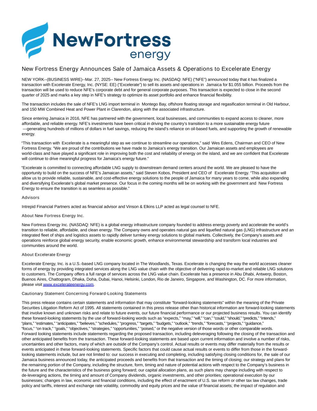 New Fortress Energy Announces Sale of Jamaica Assets & Operations to Excelerate Energy NEW YORK--(BUSINESS WIRE)--Mar. 27, 2025-- New Fortress Energy Inc. (NASDAQ: NFE) (“NFE”) announced today that it has finalized a transaction with Excelerate Energy, Inc. (NYSE: EE) (“Excelerate”) to sell its assets and operations in Jamaica for $1.055 billion. Proceeds from the transaction will be used to reduce NFE’s corporate debt and for general corporate purposes. This transaction is expected to close in the second quarter of 2025 and marks a key step in NFE’s strategy to optimize its asset portfolio and enhance financial flexibility. The transaction includes the sale of NFE’s LNG import terminal in Montego Bay, offshore floating storage and regasification terminal in Old Harbour, and 150 MW Combined Heat and Power Plant in Clarendon, along with the associated infrastructure. Since entering Jamaica in 2016, NFE has partnered with the government, local businesses, and communities to expand access to cleaner, more affordable, and reliable energy. NFE’s investments have been critical in driving the country’s transition to a more sustainable energy future —generating hundreds of millions of dollars in fuel savings, reducing the island’s reliance on oil-based fuels, and supporting the growth of renewable energy. “This transaction with Excelerate is a meaningful step as we continue to streamline our operations,” said Wes Edens, Chairman and CEO of New Fortress Energy. “We are proud of the contributions we have made to Jamaica’s energy transition. Our Jamaican assets and employees are world-class and have played a significant role in improving both the cost and reliability of energy on the island, and we are confident that Excelerate will continue to drive meaningful progress for Jamaica’s energy future.” “Excelerate is committed to connecting affordable LNG supply to downstream demand centers around the world. We are pleased to have the opportunity to build on the success of NFE’s Jamaican assets,” said Steven Kobos, President and CEO of Excelerate Energy. “This acquisition will allow us to provide reliable, sustainable, and cost-effective energy solutions to the people of Jamaica for many years to come, while also expanding and diversifying Excelerate’s global market presence. Our focus in the coming months will be on working with the government and New Fortress Energy to ensure the transition is as seamless as possible.” Advisors Intrepid Financial Partners acted as financial advisor and Vinson & Elkins LLP acted as legal counsel to NFE. About New Fortress Energy Inc. New Fortress Energy Inc. (NASDAQ: NFE) is a global energy infrastructure company founded to address energy poverty and accelerate the world’s transition to reliable, affordable, and clean energy. The Company owns and operates natural gas and liquefied natural gas (LNG) infrastructure and an integrated fleet of ships and logistics assets to rapidly deliver turnkey energy solutions to global markets. Collectively, the Company’s assets and operations reinforce global energy security, enable economic growth, enhance environmental stewardship and transform local industries and communities around the world. About Excelerate Energy Excelerate Energy, Inc. is a U.S.-based LNG company located in The Woodlands, Texas. Excelerate is changing the way the world accesses cleaner forms of energy by providing integrated services along the LNG value chain with the objective of delivering rapid-to-market and reliable LNG solutions to customers. The Company offers a full range of services across the LNG value chain. Excelerate has a presence in Abu Dhabi, Antwerp, Boston, Buenos Aires, Chattogram, Dhaka, Doha, Dubai, Hanoi, Helsinki, London, Rio de Janeiro, Singapore, and Washington, DC. For more information, please visit www.excelerateenergy.com. Cautionary Statement Concerning Forward-Looking Statements This press release contains certain statements and information that may constitute “forward-looking statements” within the meaning of the Private Securities Litigation Reform Act of 1995. All statements contained in this press release other than historical information are forward-looking statements that involve known and unknown risks and relate to future events, our future financial performance or our projected business results. You can identify these forward-looking statements by the use of forward-looking words such as “expects,” “may,” “will,” “can,” “could,” “should,” “predicts,” “intends,” “plans,” “estimates,” “anticipates,” “believes,” “schedules,” “progress,” “targets,” “budgets,” “outlook,” “trends,” “forecasts,” “projects,” “guidance,” “focus,” “on track,” “goals,” “objectives,” “strategies,” “opportunities,” “poised,” or the negative version of those words or other comparable words. Forward looking statements include statements regarding the proposed transaction, including deleveraging following the closing of the transaction and other anticipated benefits from the transaction. These forward-looking statements are based upon current information and involve a number of risks, uncertainties and other factors, many of which are outside of the Company’s control. Actual results or events may differ materially from the results or events anticipated in these forward-looking statements. Specific factors that could cause actual results or events to differ from those in the forward- looking statements include, but are not limited to: our success in executing and completing, including satisfying closing conditions for, the sale of our Jamaica business announced today, the anticipated proceeds and benefits from that transaction and the timing of closing; our strategy and plans for the remaining portion of the Company, including the structure, form, timing and nature of potential actions wit