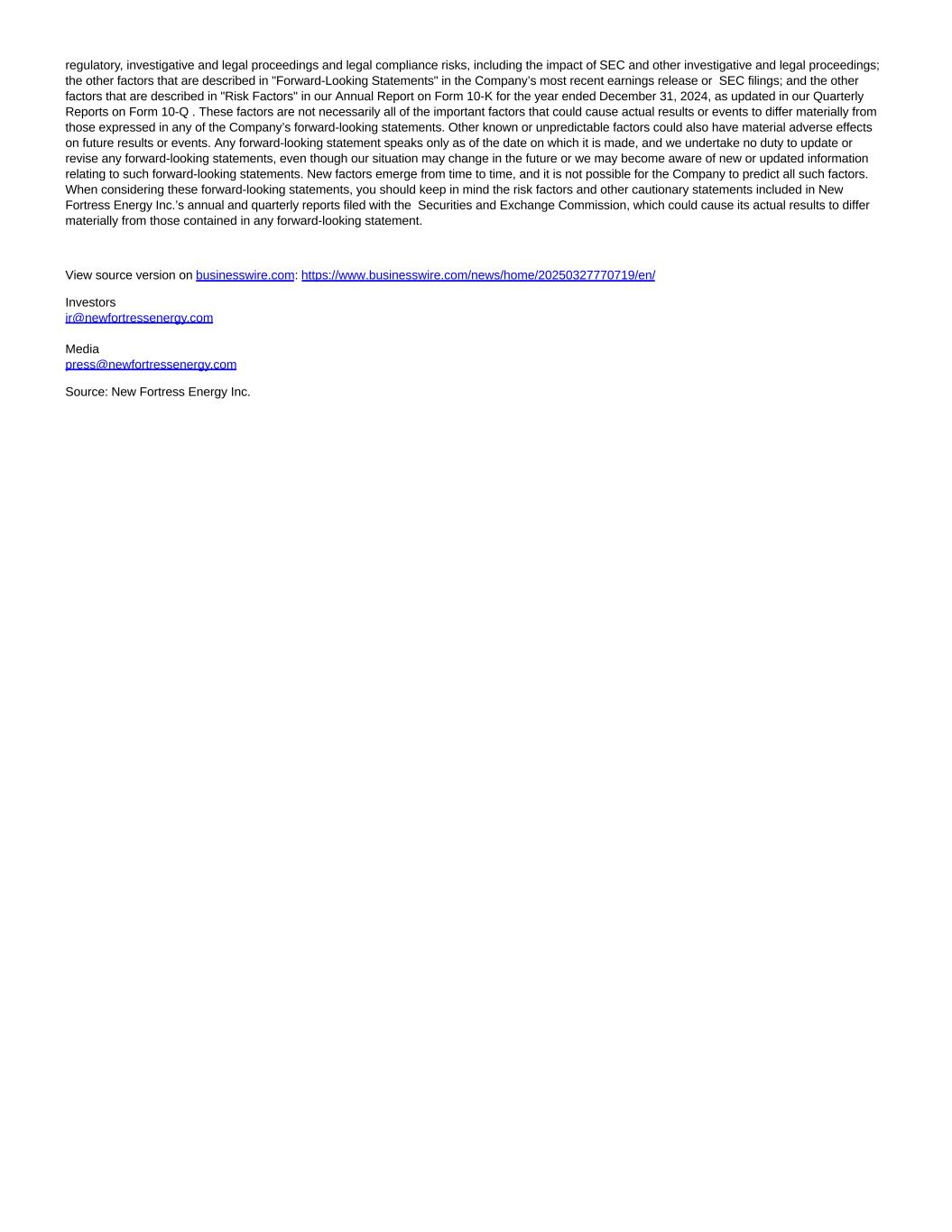 regulatory, investigative and legal proceedings and legal compliance risks, including the impact of SEC and other investigative and legal proceedings; the other factors that are described in "Forward-Looking Statements" in the Company’s most recent earnings release or SEC filings; and the other factors that are described in "Risk Factors" in our Annual Report on Form 10-K for the year ended December 31, 2024, as updated in our Quarterly Reports on Form 10-Q . These factors are not necessarily all of the important factors that could cause actual results or events to differ materially from those expressed in any of the Company’s forward-looking statements. Other known or unpredictable factors could also have material adverse effects on future results or events. Any forward-looking statement speaks only as of the date on which it is made, and we undertake no duty to update or revise any forward-looking statements, even though our situation may change in the future or we may become aware of new or updated information relating to such forward-looking statements. New factors emerge from time to time, and it is not possible for the Company to predict all such factors. When considering these forward-looking statements, you should keep in mind the risk factors and other cautionary statements included in New Fortress Energy Inc.’s annual and quarterly reports filed with the Securities and Exchange Commission, which could cause its actual results to differ materially from those contained in any forward-looking statement. View source version on businesswire.com: https://www.businesswire.com/news/home/20250327770719/en/ Investors ir@newfortressenergy.com Media press@newfortressenergy.com Source: New Fortress Energy Inc.