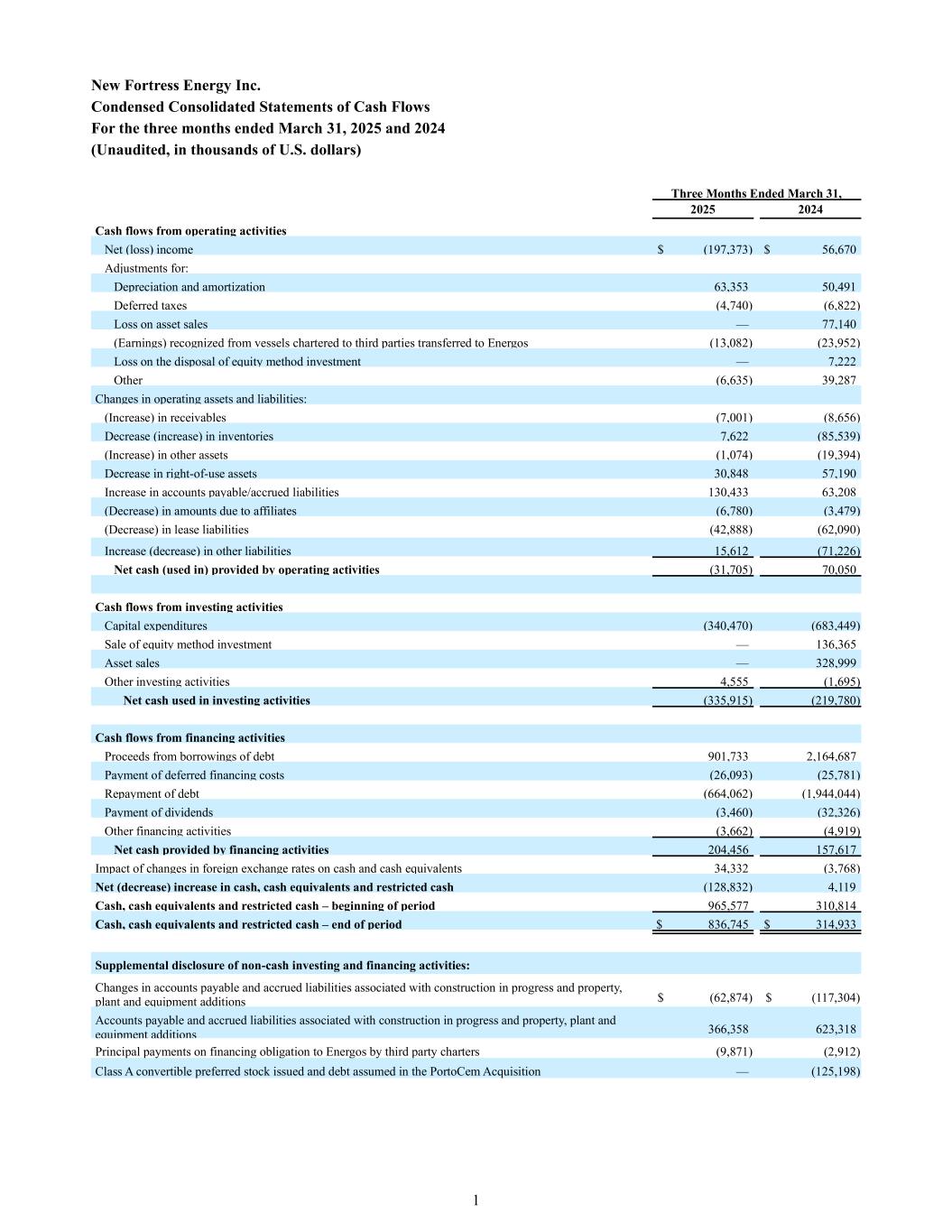 1 New Fortress Energy Inc. Condensed Consolidated Statements of Cash Flows For the three months ended March 31, 2025 and 2024 (Unaudited, in thousands of U.S. dollars) Three Months Ended March 31, 2025 2024 Cash flows from operating activities Net (loss) income $ (197,373) $ 56,670 Adjustments for: Depreciation and amortization 63,353 50,491 Deferred taxes (4,740) (6,822) Loss on asset sales — 77,140 (Earnings) recognized from vessels chartered to third parties transferred to Energos (13,082) (23,952) Loss on the disposal of equity method investment — 7,222 Other (6,635) 39,287 Changes in operating assets and liabilities: (Increase) in receivables (7,001) (8,656) Decrease (increase) in inventories 7,622 (85,539) (Increase) in other assets (1,074) (19,394) Decrease in right-of-use assets 30,848 57,190 Increase in accounts payable/accrued liabilities 130,433 63,208 (Decrease) in amounts due to affiliates (6,780) (3,479) (Decrease) in lease liabilities (42,888) (62,090) Increase (decrease) in other liabilities 15,612 (71,226) Net cash (used in) provided by operating activities (31,705) 70,050 Cash flows from investing activities Capital expenditures (340,470) (683,449) Sale of equity method investment — 136,365 Asset sales — 328,999 Other investing activities 4,555 (1,695) Net cash used in investing activities (335,915) (219,780) Cash flows from financing activities Proceeds from borrowings of debt 901,733 2,164,687 Payment of deferred financing costs (26,093) (25,781) Repayment of debt (664,062) (1,944,044) Payment of dividends (3,460) (32,326) Other financing activities (3,662) (4,919) Net cash provided by financing activities 204,456 157,617 Impact of changes in foreign exchange rates on cash and cash equivalents 34,332 (3,768) Net (decrease) increase in cash, cash equivalents and restricted cash (128,832) 4,119 Cash, cash equivalents and restricted cash – beginning of period 965,577 310,814 Cash, cash equivalents and restricted cash – end of period $ 836,745 $ 314,933 Supplemental disclosure of non-cash investing and financing activities: Changes in accounts payable and accrued liabilities associated with construction in progress and property, plant and equipment additions $ (62,874) $ (117,304) Accounts payable and accrued liabilities associated with construction in progress and property, plant and equipment additions 366,358 623,318 Principal payments on financing obligation to Energos by third party charters (9,871) (2,912) Class A convertible preferred stock issued and debt assumed in the PortoCem Acquisition — (125,198)