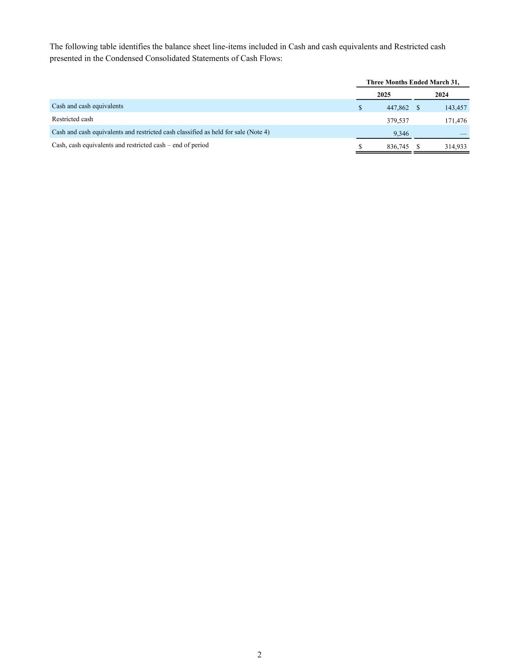 2 The following table identifies the balance sheet line-items included in Cash and cash equivalents and Restricted cash presented in the Condensed Consolidated Statements of Cash Flows: Three Months Ended March 31, 2025 2024 Cash and cash equivalents $ 447,862 $ 143,457 Restricted cash 379,537 171,476 Cash and cash equivalents and restricted cash classified as held for sale (Note 4) 9,346 — Cash, cash equivalents and restricted cash – end of period $ 836,745 $ 314,933