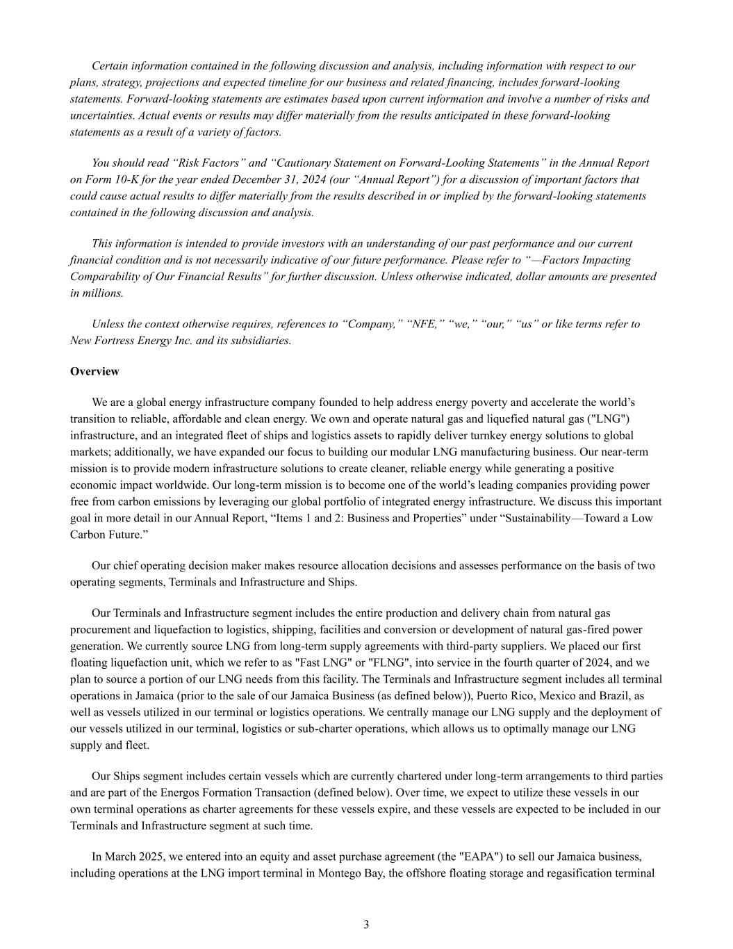 3 Certain information contained in the following discussion and analysis, including information with respect to our plans, strategy, projections and expected timeline for our business and related financing, includes forward-looking statements. Forward-looking statements are estimates based upon current information and involve a number of risks and uncertainties. Actual events or results may differ materially from the results anticipated in these forward-looking statements as a result of a variety of factors. You should read “Risk Factors” and “Cautionary Statement on Forward-Looking Statements” in the Annual Report on Form 10-K for the year ended December 31, 2024 (our “Annual Report”) for a discussion of important factors that could cause actual results to differ materially from the results described in or implied by the forward-looking statements contained in the following discussion and analysis. This information is intended to provide investors with an understanding of our past performance and our current financial condition and is not necessarily indicative of our future performance. Please refer to “—Factors Impacting Comparability of Our Financial Results” for further discussion. Unless otherwise indicated, dollar amounts are presented in millions. Unless the context otherwise requires, references to “Company,” “NFE,” “we,” “our,” “us” or like terms refer to New Fortress Energy Inc. and its subsidiaries. Overview We are a global energy infrastructure company founded to help address energy poverty and accelerate the world’s transition to reliable, affordable and clean energy. We own and operate natural gas and liquefied natural gas ("LNG") infrastructure, and an integrated fleet of ships and logistics assets to rapidly deliver turnkey energy solutions to global markets; additionally, we have expanded our focus to building our modular LNG manufacturing business. Our near-term mission is to provide modern infrastructure solutions to create cleaner, reliable energy while generating a positive economic impact worldwide. Our long-term mission is to become one of the world’s leading companies providing power free from carbon emissions by leveraging our global portfolio of integrated energy infrastructure. We discuss this important goal in more detail in our Annual Report, “Items 1 and 2: Business and Properties” under “Sustainability—Toward a Low Carbon Future.” Our chief operating decision maker makes resource allocation decisions and assesses performance on the basis of two operating segments, Terminals and Infrastructure and Ships. Our Terminals and Infrastructure segment includes the entire production and delivery chain from natural gas procurement and liquefaction to logistics, shipping, facilities and conversion or development of natural gas-fired power generation. We currently source LNG from long-term supply agreements with third-party suppliers. We placed our first floating liquefaction unit, which we refer to as "Fast LNG" or "FLNG", into service in the fourth quarter of 2024, and we plan to source a portion of our LNG needs from this facility. The Terminals and Infrastructure segment includes all terminal operations in Jamaica (prior to the sale of our Jamaica Business (as defined below)), Puerto Rico, Mexico and Brazil, as well as vessels utilized in our terminal or logistics operations. We centrally manage our LNG supply and the deployment of our vessels utilized in our terminal, logistics or sub-charter operations, which allows us to optimally manage our LNG supply and fleet. Our Ships segment includes certain vessels which are currently chartered under long-term arrangements to third parties and are part of the Energos Formation Transaction (defined below). Over time, we expect to utilize these vessels in our own terminal operations as charter agreements for these vessels expire, and these vessels are expected to be included in our Terminals and Infrastructure segment at such time. In March 2025, we entered into an equity and asset purchase agreement (the "EAPA") to sell our Jamaica business, including operations at the LNG import terminal in Montego Bay, the offshore floating storage and regasification terminal