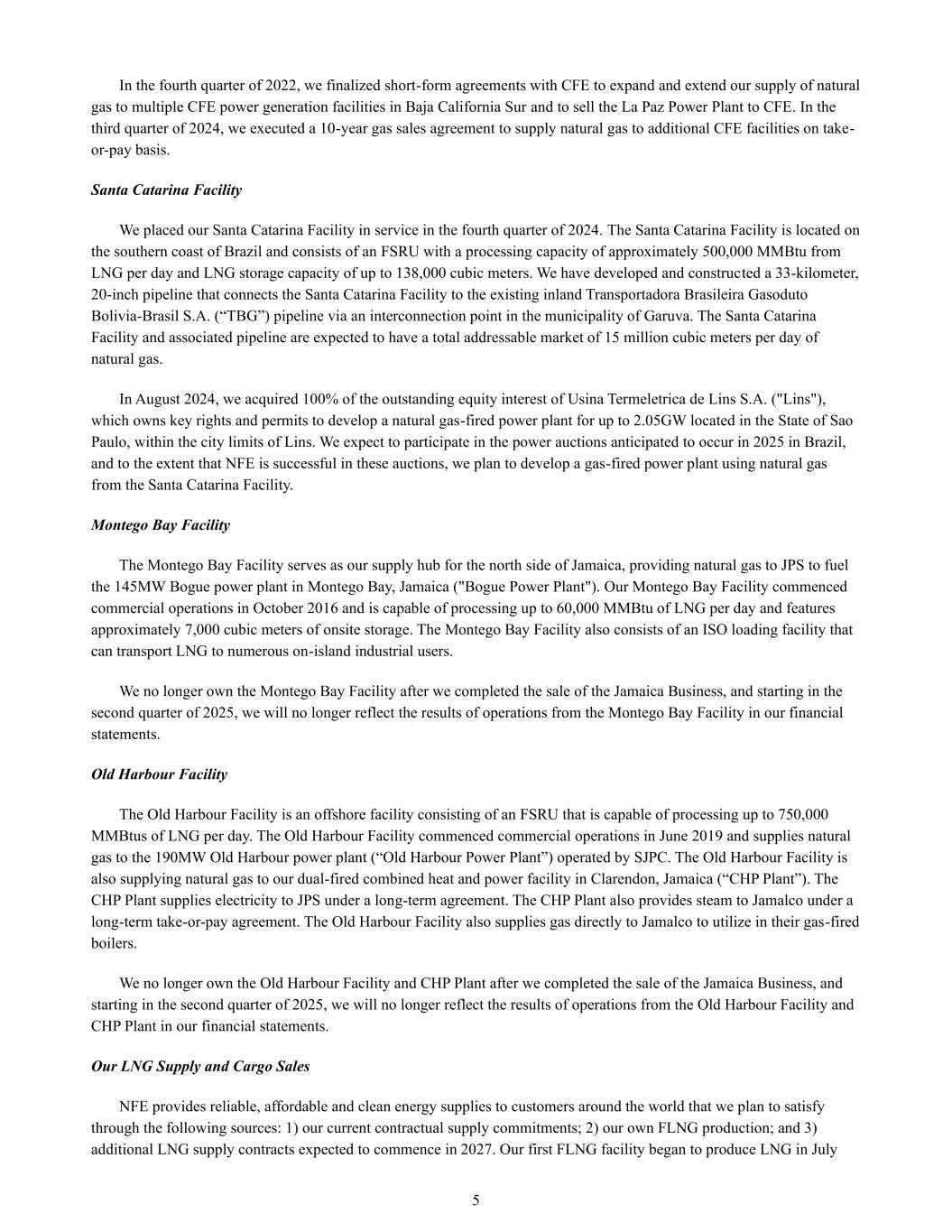 5 In the fourth quarter of 2022, we finalized short-form agreements with CFE to expand and extend our supply of natural gas to multiple CFE power generation facilities in Baja California Sur and to sell the La Paz Power Plant to CFE. In the third quarter of 2024, we executed a 10-year gas sales agreement to supply natural gas to additional CFE facilities on take- or-pay basis. Santa Catarina Facility We placed our Santa Catarina Facility in service in the fourth quarter of 2024. The Santa Catarina Facility is located on the southern coast of Brazil and consists of an FSRU with a processing capacity of approximately 500,000 MMBtu from LNG per day and LNG storage capacity of up to 138,000 cubic meters. We have developed and constructed a 33-kilometer, 20-inch pipeline that connects the Santa Catarina Facility to the existing inland Transportadora Brasileira Gasoduto Bolivia-Brasil S.A. (“TBG”) pipeline via an interconnection point in the municipality of Garuva. The Santa Catarina Facility and associated pipeline are expected to have a total addressable market of 15 million cubic meters per day of natural gas. In August 2024, we acquired 100% of the outstanding equity interest of Usina Termeletrica de Lins S.A. ("Lins"), which owns key rights and permits to develop a natural gas-fired power plant for up to 2.05GW located in the State of Sao Paulo, within the city limits of Lins. We expect to participate in the power auctions anticipated to occur in 2025 in Brazil, and to the extent that NFE is successful in these auctions, we plan to develop a gas-fired power plant using natural gas from the Santa Catarina Facility. Montego Bay Facility The Montego Bay Facility serves as our supply hub for the north side of Jamaica, providing natural gas to JPS to fuel the 145MW Bogue power plant in Montego Bay, Jamaica ("Bogue Power Plant"). Our Montego Bay Facility commenced commercial operations in October 2016 and is capable of processing up to 60,000 MMBtu of LNG per day and features approximately 7,000 cubic meters of onsite storage. The Montego Bay Facility also consists of an ISO loading facility that can transport LNG to numerous on-island industrial users. We no longer own the Montego Bay Facility after we completed the sale of the Jamaica Business, and starting in the second quarter of 2025, we will no longer reflect the results of operations from the Montego Bay Facility in our financial statements. Old Harbour Facility The Old Harbour Facility is an offshore facility consisting of an FSRU that is capable of processing up to 750,000 MMBtus of LNG per day. The Old Harbour Facility commenced commercial operations in June 2019 and supplies natural gas to the 190MW Old Harbour power plant (“Old Harbour Power Plant”) operated by SJPC. The Old Harbour Facility is also supplying natural gas to our dual-fired combined heat and power facility in Clarendon, Jamaica (“CHP Plant”). The CHP Plant supplies electricity to JPS under a long-term agreement. The CHP Plant also provides steam to Jamalco under a long-term take-or-pay agreement. The Old Harbour Facility also supplies gas directly to Jamalco to utilize in their gas-fired boilers. We no longer own the Old Harbour Facility and CHP Plant after we completed the sale of the Jamaica Business, and starting in the second quarter of 2025, we will no longer reflect the results of operations from the Old Harbour Facility and CHP Plant in our financial statements. Our LNG Supply and Cargo Sales NFE provides reliable, affordable and clean energy supplies to customers around the world that we plan to satisfy through the following sources: 1) our current contractual supply commitments; 2) our own FLNG production; and 3) additional LNG supply contracts expected to commence in 2027. Our first FLNG facility began to produce LNG in July