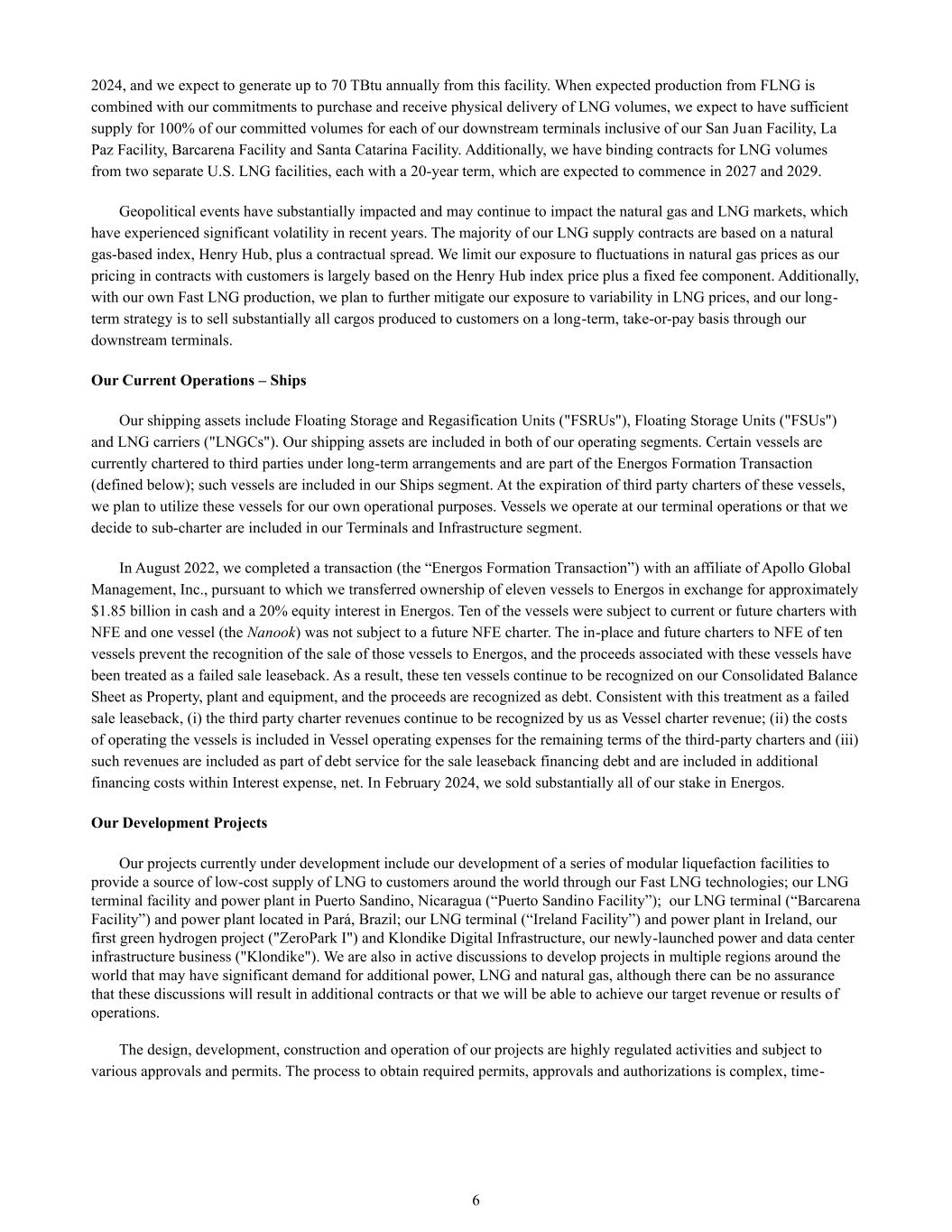 6 2024, and we expect to generate up to 70 TBtu annually from this facility. When expected production from FLNG is combined with our commitments to purchase and receive physical delivery of LNG volumes, we expect to have sufficient supply for 100% of our committed volumes for each of our downstream terminals inclusive of our San Juan Facility, La Paz Facility, Barcarena Facility and Santa Catarina Facility. Additionally, we have binding contracts for LNG volumes from two separate U.S. LNG facilities, each with a 20-year term, which are expected to commence in 2027 and 2029. Geopolitical events have substantially impacted and may continue to impact the natural gas and LNG markets, which have experienced significant volatility in recent years. The majority of our LNG supply contracts are based on a natural gas-based index, Henry Hub, plus a contractual spread. We limit our exposure to fluctuations in natural gas prices as our pricing in contracts with customers is largely based on the Henry Hub index price plus a fixed fee component. Additionally, with our own Fast LNG production, we plan to further mitigate our exposure to variability in LNG prices, and our long- term strategy is to sell substantially all cargos produced to customers on a long-term, take-or-pay basis through our downstream terminals. Our Current Operations – Ships Our shipping assets include Floating Storage and Regasification Units ("FSRUs"), Floating Storage Units ("FSUs") and LNG carriers ("LNGCs"). Our shipping assets are included in both of our operating segments. Certain vessels are currently chartered to third parties under long-term arrangements and are part of the Energos Formation Transaction (defined below); such vessels are included in our Ships segment. At the expiration of third party charters of these vessels, we plan to utilize these vessels for our own operational purposes. Vessels we operate at our terminal operations or that we decide to sub-charter are included in our Terminals and Infrastructure segment. In August 2022, we completed a transaction (the “Energos Formation Transaction”) with an affiliate of Apollo Global Management, Inc., pursuant to which we transferred ownership of eleven vessels to Energos in exchange for approximately $1.85 billion in cash and a 20% equity interest in Energos. Ten of the vessels were subject to current or future charters with NFE and one vessel (the Nanook) was not subject to a future NFE charter. The in-place and future charters to NFE of ten vessels prevent the recognition of the sale of those vessels to Energos, and the proceeds associated with these vessels have been treated as a failed sale leaseback. As a result, these ten vessels continue to be recognized on our Consolidated Balance Sheet as Property, plant and equipment, and the proceeds are recognized as debt. Consistent with this treatment as a failed sale leaseback, (i) the third party charter revenues continue to be recognized by us as Vessel charter revenue; (ii) the costs of operating the vessels is included in Vessel operating expenses for the remaining terms of the third-party charters and (iii) such revenues are included as part of debt service for the sale leaseback financing debt and are included in additional financing costs within Interest expense, net. In February 2024, we sold substantially all of our stake in Energos. Our Development Projects Our projects currently under development include our development of a series of modular liquefaction facilities to provide a source of low-cost supply of LNG to customers around the world through our Fast LNG technologies; our LNG terminal facility and power plant in Puerto Sandino, Nicaragua (“Puerto Sandino Facility”); our LNG terminal (“Barcarena Facility”) and power plant located in Pará, Brazil; our LNG terminal (“Ireland Facility”) and power plant in Ireland, our first green hydrogen project ("ZeroPark I") and Klondike Digital Infrastructure, our newly-launched power and data center infrastructure business ("Klondike"). We are also in active discussions to develop projects in multiple regions around the world that may have significant demand for additional power, LNG and natural gas, although there can be no assurance that these discussions will result in additional contracts or that we will be able to achieve our target revenue or results of operations. The design, development, construction and operation of our projects are highly regulated activities and subject to various approvals and permits. The process to obtain required permits, approvals and authorizations is complex, time-