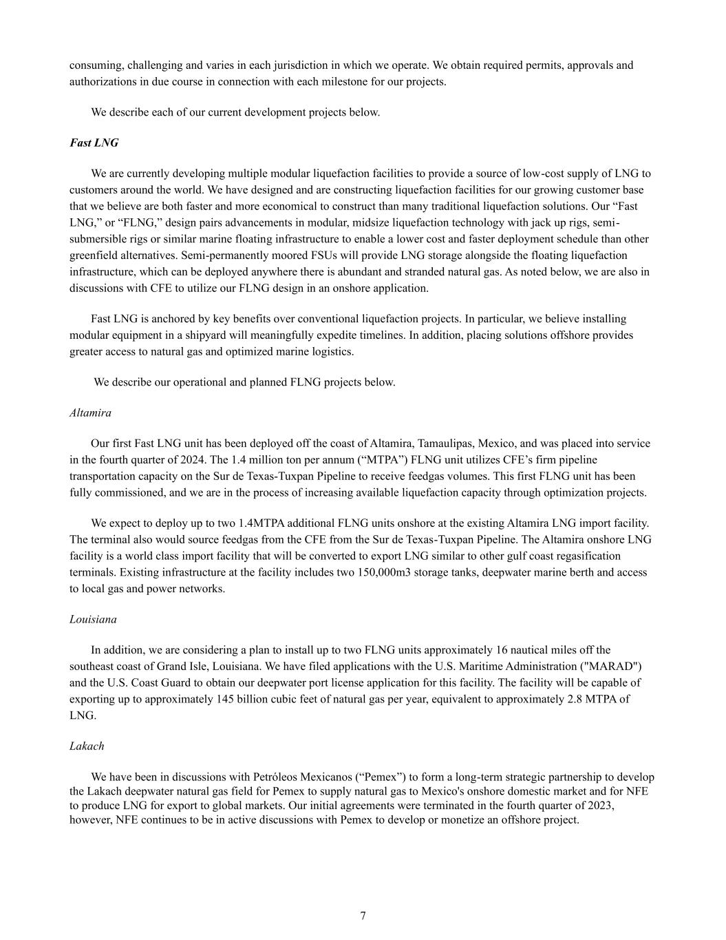 7 consuming, challenging and varies in each jurisdiction in which we operate. We obtain required permits, approvals and authorizations in due course in connection with each milestone for our projects. We describe each of our current development projects below. Fast LNG We are currently developing multiple modular liquefaction facilities to provide a source of low-cost supply of LNG to customers around the world. We have designed and are constructing liquefaction facilities for our growing customer base that we believe are both faster and more economical to construct than many traditional liquefaction solutions. Our “Fast LNG,” or “FLNG,” design pairs advancements in modular, midsize liquefaction technology with jack up rigs, semi- submersible rigs or similar marine floating infrastructure to enable a lower cost and faster deployment schedule than other greenfield alternatives. Semi-permanently moored FSUs will provide LNG storage alongside the floating liquefaction infrastructure, which can be deployed anywhere there is abundant and stranded natural gas. As noted below, we are also in discussions with CFE to utilize our FLNG design in an onshore application. Fast LNG is anchored by key benefits over conventional liquefaction projects. In particular, we believe installing modular equipment in a shipyard will meaningfully expedite timelines. In addition, placing solutions offshore provides greater access to natural gas and optimized marine logistics. We describe our operational and planned FLNG projects below. Altamira Our first Fast LNG unit has been deployed off the coast of Altamira, Tamaulipas, Mexico, and was placed into service in the fourth quarter of 2024. The 1.4 million ton per annum (“MTPA”) FLNG unit utilizes CFE’s firm pipeline transportation capacity on the Sur de Texas-Tuxpan Pipeline to receive feedgas volumes. This first FLNG unit has been fully commissioned, and we are in the process of increasing available liquefaction capacity through optimization projects. We expect to deploy up to two 1.4MTPA additional FLNG units onshore at the existing Altamira LNG import facility. The terminal also would source feedgas from the CFE from the Sur de Texas-Tuxpan Pipeline. The Altamira onshore LNG facility is a world class import facility that will be converted to export LNG similar to other gulf coast regasification terminals. Existing infrastructure at the facility includes two 150,000m3 storage tanks, deepwater marine berth and access to local gas and power networks. Louisiana In addition, we are considering a plan to install up to two FLNG units approximately 16 nautical miles off the southeast coast of Grand Isle, Louisiana. We have filed applications with the U.S. Maritime Administration ("MARAD") and the U.S. Coast Guard to obtain our deepwater port license application for this facility. The facility will be capable of exporting up to approximately 145 billion cubic feet of natural gas per year, equivalent to approximately 2.8 MTPA of LNG. Lakach We have been in discussions with Petróleos Mexicanos (“Pemex”) to form a long-term strategic partnership to develop the Lakach deepwater natural gas field for Pemex to supply natural gas to Mexico's onshore domestic market and for NFE to produce LNG for export to global markets. Our initial agreements were terminated in the fourth quarter of 2023, however, NFE continues to be in active discussions with Pemex to develop or monetize an offshore project.