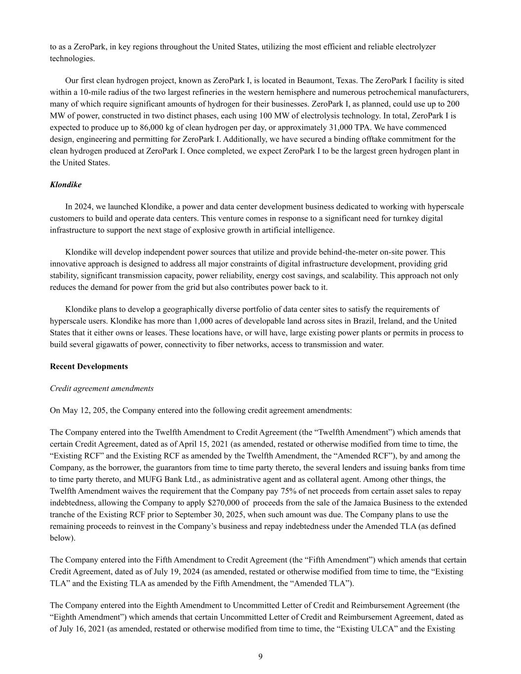 9 to as a ZeroPark, in key regions throughout the United States, utilizing the most efficient and reliable electrolyzer technologies. Our first clean hydrogen project, known as ZeroPark I, is located in Beaumont, Texas. The ZeroPark I facility is sited within a 10-mile radius of the two largest refineries in the western hemisphere and numerous petrochemical manufacturers, many of which require significant amounts of hydrogen for their businesses. ZeroPark I, as planned, could use up to 200 MW of power, constructed in two distinct phases, each using 100 MW of electrolysis technology. In total, ZeroPark I is expected to produce up to 86,000 kg of clean hydrogen per day, or approximately 31,000 TPA. We have commenced design, engineering and permitting for ZeroPark I. Additionally, we have secured a binding offtake commitment for the clean hydrogen produced at ZeroPark I. Once completed, we expect ZeroPark I to be the largest green hydrogen plant in the United States. Klondike In 2024, we launched Klondike, a power and data center development business dedicated to working with hyperscale customers to build and operate data centers. This venture comes in response to a significant need for turnkey digital infrastructure to support the next stage of explosive growth in artificial intelligence. Klondike will develop independent power sources that utilize and provide behind-the-meter on-site power. This innovative approach is designed to address all major constraints of digital infrastructure development, providing grid stability, significant transmission capacity, power reliability, energy cost savings, and scalability. This approach not only reduces the demand for power from the grid but also contributes power back to it. Klondike plans to develop a geographically diverse portfolio of data center sites to satisfy the requirements of hyperscale users. Klondike has more than 1,000 acres of developable land across sites in Brazil, Ireland, and the United States that it either owns or leases. These locations have, or will have, large existing power plants or permits in process to build several gigawatts of power, connectivity to fiber networks, access to transmission and water. Recent Developments Credit agreement amendments On May 12, 205, the Company entered into the following credit agreement amendments: The Company entered into the Twelfth Amendment to Credit Agreement (the “Twelfth Amendment”) which amends that certain Credit Agreement, dated as of April 15, 2021 (as amended, restated or otherwise modified from time to time, the “Existing RCF” and the Existing RCF as amended by the Twelfth Amendment, the “Amended RCF”), by and among the Company, as the borrower, the guarantors from time to time party thereto, the several lenders and issuing banks from time to time party thereto, and MUFG Bank Ltd., as administrative agent and as collateral agent. Among other things, the Twelfth Amendment waives the requirement that the Company pay 75% of net proceeds from certain asset sales to repay indebtedness, allowing the Company to apply $270,000 of proceeds from the sale of the Jamaica Business to the extended tranche of the Existing RCF prior to September 30, 2025, when such amount was due. The Company plans to use the remaining proceeds to reinvest in the Company’s business and repay indebtedness under the Amended TLA (as defined below). The Company entered into the Fifth Amendment to Credit Agreement (the “Fifth Amendment”) which amends that certain Credit Agreement, dated as of July 19, 2024 (as amended, restated or otherwise modified from time to time, the “Existing TLA” and the Existing TLA as amended by the Fifth Amendment, the “Amended TLA”). The Company entered into the Eighth Amendment to Uncommitted Letter of Credit and Reimbursement Agreement (the “Eighth Amendment”) which amends that certain Uncommitted Letter of Credit and Reimbursement Agreement, dated as of July 16, 2021 (as amended, restated or otherwise modified from time to time, the “Existing ULCA” and the Existing