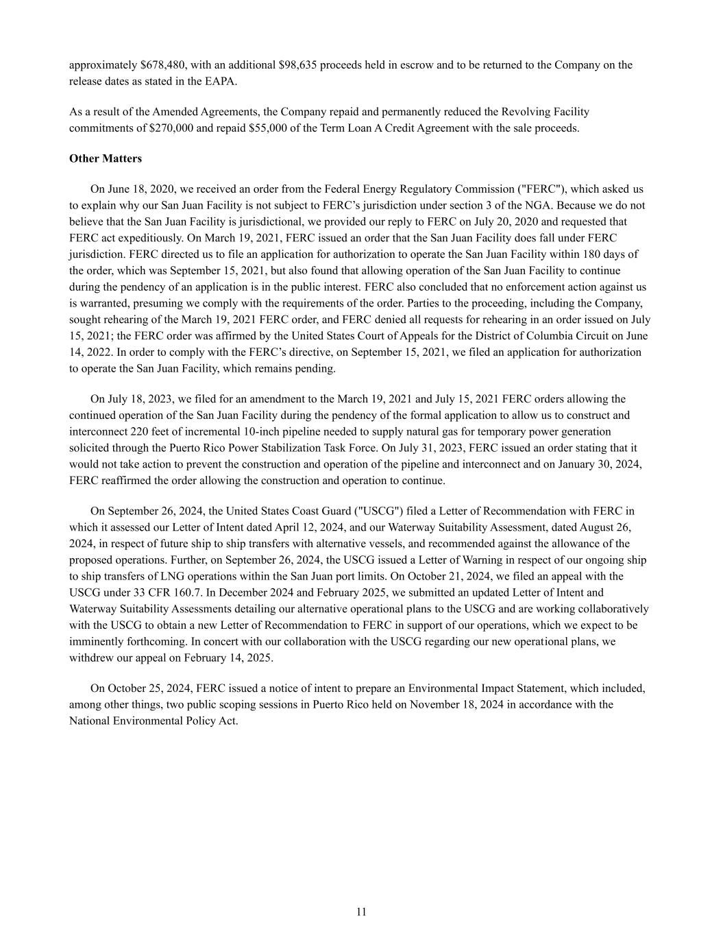 11 approximately $678,480, with an additional $98,635 proceeds held in escrow and to be returned to the Company on the release dates as stated in the EAPA. As a result of the Amended Agreements, the Company repaid and permanently reduced the Revolving Facility commitments of $270,000 and repaid $55,000 of the Term Loan A Credit Agreement with the sale proceeds. Other Matters On June 18, 2020, we received an order from the Federal Energy Regulatory Commission ("FERC"), which asked us to explain why our San Juan Facility is not subject to FERC’s jurisdiction under section 3 of the NGA. Because we do not believe that the San Juan Facility is jurisdictional, we provided our reply to FERC on July 20, 2020 and requested that FERC act expeditiously. On March 19, 2021, FERC issued an order that the San Juan Facility does fall under FERC jurisdiction. FERC directed us to file an application for authorization to operate the San Juan Facility within 180 days of the order, which was September 15, 2021, but also found that allowing operation of the San Juan Facility to continue during the pendency of an application is in the public interest. FERC also concluded that no enforcement action against us is warranted, presuming we comply with the requirements of the order. Parties to the proceeding, including the Company, sought rehearing of the March 19, 2021 FERC order, and FERC denied all requests for rehearing in an order issued on July 15, 2021; the FERC order was affirmed by the United States Court of Appeals for the District of Columbia Circuit on June 14, 2022. In order to comply with the FERC’s directive, on September 15, 2021, we filed an application for authorization to operate the San Juan Facility, which remains pending. On July 18, 2023, we filed for an amendment to the March 19, 2021 and July 15, 2021 FERC orders allowing the continued operation of the San Juan Facility during the pendency of the formal application to allow us to construct and interconnect 220 feet of incremental 10-inch pipeline needed to supply natural gas for temporary power generation solicited through the Puerto Rico Power Stabilization Task Force. On July 31, 2023, FERC issued an order stating that it would not take action to prevent the construction and operation of the pipeline and interconnect and on January 30, 2024, FERC reaffirmed the order allowing the construction and operation to continue. On September 26, 2024, the United States Coast Guard ("USCG") filed a Letter of Recommendation with FERC in which it assessed our Letter of Intent dated April 12, 2024, and our Waterway Suitability Assessment, dated August 26, 2024, in respect of future ship to ship transfers with alternative vessels, and recommended against the allowance of the proposed operations. Further, on September 26, 2024, the USCG issued a Letter of Warning in respect of our ongoing ship to ship transfers of LNG operations within the San Juan port limits. On October 21, 2024, we filed an appeal with the USCG under 33 CFR 160.7. In December 2024 and February 2025, we submitted an updated Letter of Intent and Waterway Suitability Assessments detailing our alternative operational plans to the USCG and are working collaboratively with the USCG to obtain a new Letter of Recommendation to FERC in support of our operations, which we expect to be imminently forthcoming. In concert with our collaboration with the USCG regarding our new operational plans, we withdrew our appeal on February 14, 2025. On October 25, 2024, FERC issued a notice of intent to prepare an Environmental Impact Statement, which included, among other things, two public scoping sessions in Puerto Rico held on November 18, 2024 in accordance with the National Environmental Policy Act.