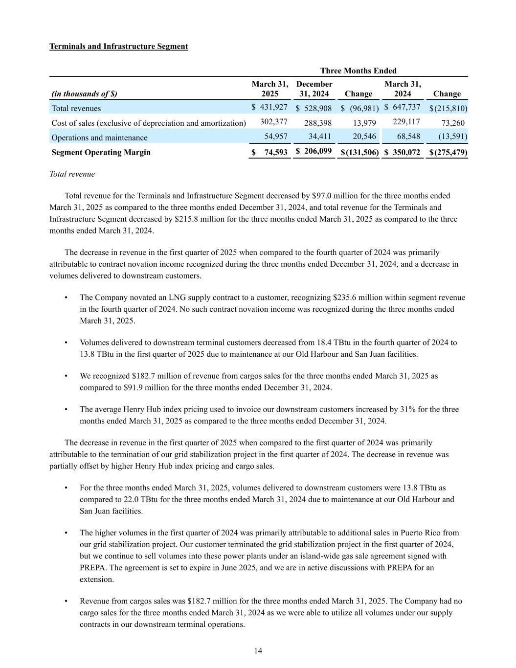 14 Terminals and Infrastructure Segment Three Months Ended (in thousands of $) March 31, 2025 December 31, 2024 Change March 31, 2024 Change Total revenues $ 431,927 $ 528,908 $ (96,981) $ 647,737 $ (215,810) Cost of sales (exclusive of depreciation and amortization) 302,377 288,398 13,979 229,117 73,260 Operations and maintenance 54,957 34,411 20,546 68,548 (13,591) Segment Operating Margin $ 74,593 $ 206,099 $ (131,506) $ 350,072 $ (275,479) Total revenue Total revenue for the Terminals and Infrastructure Segment decreased by $97.0 million for the three months ended March 31, 2025 as compared to the three months ended December 31, 2024, and total revenue for the Terminals and Infrastructure Segment decreased by $215.8 million for the three months ended March 31, 2025 as compared to the three months ended March 31, 2024. The decrease in revenue in the first quarter of 2025 when compared to the fourth quarter of 2024 was primarily attributable to contract novation income recognized during the three months ended December 31, 2024, and a decrease in volumes delivered to downstream customers. • The Company novated an LNG supply contract to a customer, recognizing $235.6 million within segment revenue in the fourth quarter of 2024. No such contract novation income was recognized during the three months ended March 31, 2025. • Volumes delivered to downstream terminal customers decreased from 18.4 TBtu in the fourth quarter of 2024 to 13.8 TBtu in the first quarter of 2025 due to maintenance at our Old Harbour and San Juan facilities. • We recognized $182.7 million of revenue from cargos sales for the three months ended March 31, 2025 as compared to $91.9 million for the three months ended December 31, 2024. • The average Henry Hub index pricing used to invoice our downstream customers increased by 31% for the three months ended March 31, 2025 as compared to the three months ended December 31, 2024. The decrease in revenue in the first quarter of 2025 when compared to the first quarter of 2024 was primarily attributable to the termination of our grid stabilization project in the first quarter of 2024. The decrease in revenue was partially offset by higher Henry Hub index pricing and cargo sales. • For the three months ended March 31, 2025, volumes delivered to downstream customers were 13.8 TBtu as compared to 22.0 TBtu for the three months ended March 31, 2024 due to maintenance at our Old Harbour and San Juan facilities. • The higher volumes in the first quarter of 2024 was primarily attributable to additional sales in Puerto Rico from our grid stabilization project. Our customer terminated the grid stabilization project in the first quarter of 2024, but we continue to sell volumes into these power plants under an island-wide gas sale agreement signed with PREPA. The agreement is set to expire in June 2025, and we are in active discussions with PREPA for an extension. • Revenue from cargos sales was $182.7 million for the three months ended March 31, 2025. The Company had no cargo sales for the three months ended March 31, 2024 as we were able to utilize all volumes under our supply contracts in our downstream terminal operations.