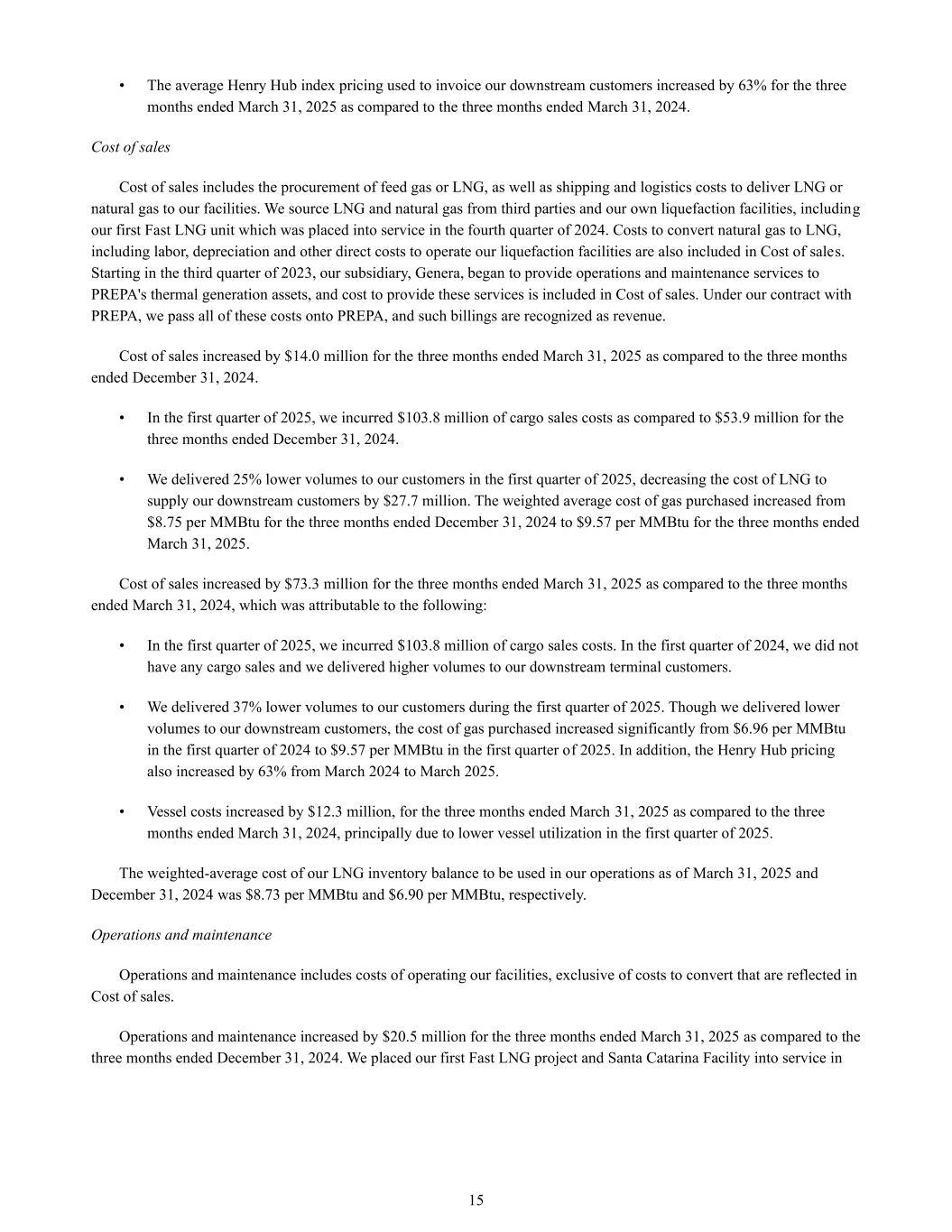 15 • The average Henry Hub index pricing used to invoice our downstream customers increased by 63% for the three months ended March 31, 2025 as compared to the three months ended March 31, 2024. Cost of sales Cost of sales includes the procurement of feed gas or LNG, as well as shipping and logistics costs to deliver LNG or natural gas to our facilities. We source LNG and natural gas from third parties and our own liquefaction facilities, including our first Fast LNG unit which was placed into service in the fourth quarter of 2024. Costs to convert natural gas to LNG, including labor, depreciation and other direct costs to operate our liquefaction facilities are also included in Cost of sales. Starting in the third quarter of 2023, our subsidiary, Genera, began to provide operations and maintenance services to PREPA's thermal generation assets, and cost to provide these services is included in Cost of sales. Under our contract with PREPA, we pass all of these costs onto PREPA, and such billings are recognized as revenue. Cost of sales increased by $14.0 million for the three months ended March 31, 2025 as compared to the three months ended December 31, 2024. • In the first quarter of 2025, we incurred $103.8 million of cargo sales costs as compared to $53.9 million for the three months ended December 31, 2024. • We delivered 25% lower volumes to our customers in the first quarter of 2025, decreasing the cost of LNG to supply our downstream customers by $27.7 million. The weighted average cost of gas purchased increased from $8.75 per MMBtu for the three months ended December 31, 2024 to $9.57 per MMBtu for the three months ended March 31, 2025. Cost of sales increased by $73.3 million for the three months ended March 31, 2025 as compared to the three months ended March 31, 2024, which was attributable to the following: • In the first quarter of 2025, we incurred $103.8 million of cargo sales costs. In the first quarter of 2024, we did not have any cargo sales and we delivered higher volumes to our downstream terminal customers. • We delivered 37% lower volumes to our customers during the first quarter of 2025. Though we delivered lower volumes to our downstream customers, the cost of gas purchased increased significantly from $6.96 per MMBtu in the first quarter of 2024 to $9.57 per MMBtu in the first quarter of 2025. In addition, the Henry Hub pricing also increased by 63% from March 2024 to March 2025. • Vessel costs increased by $12.3 million, for the three months ended March 31, 2025 as compared to the three months ended March 31, 2024, principally due to lower vessel utilization in the first quarter of 2025. The weighted-average cost of our LNG inventory balance to be used in our operations as of March 31, 2025 and December 31, 2024 was $8.73 per MMBtu and $6.90 per MMBtu, respectively. Operations and maintenance Operations and maintenance includes costs of operating our facilities, exclusive of costs to convert that are reflected in Cost of sales. Operations and maintenance increased by $20.5 million for the three months ended March 31, 2025 as compared to the three months ended December 31, 2024. We placed our first Fast LNG project and Santa Catarina Facility into service in