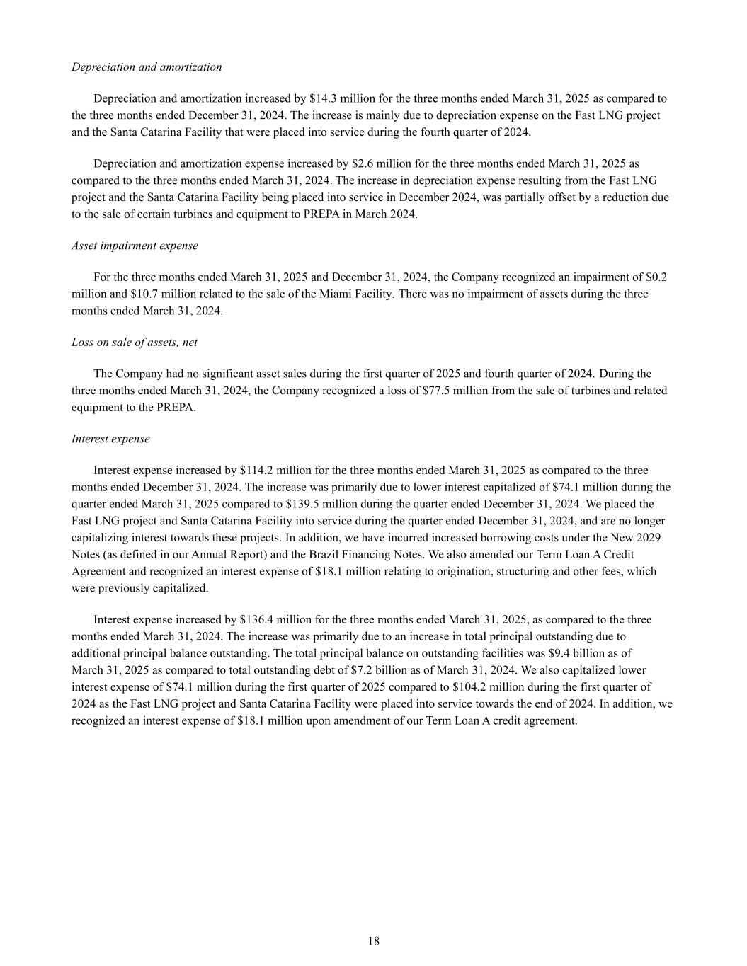 18 Depreciation and amortization Depreciation and amortization increased by $14.3 million for the three months ended March 31, 2025 as compared to the three months ended December 31, 2024. The increase is mainly due to depreciation expense on the Fast LNG project and the Santa Catarina Facility that were placed into service during the fourth quarter of 2024. Depreciation and amortization expense increased by $2.6 million for the three months ended March 31, 2025 as compared to the three months ended March 31, 2024. The increase in depreciation expense resulting from the Fast LNG project and the Santa Catarina Facility being placed into service in December 2024, was partially offset by a reduction due to the sale of certain turbines and equipment to PREPA in March 2024. Asset impairment expense For the three months ended March 31, 2025 and December 31, 2024, the Company recognized an impairment of $0.2 million and $10.7 million related to the sale of the Miami Facility. There was no impairment of assets during the three months ended March 31, 2024. Loss on sale of assets, net The Company had no significant asset sales during the first quarter of 2025 and fourth quarter of 2024. During the three months ended March 31, 2024, the Company recognized a loss of $77.5 million from the sale of turbines and related equipment to the PREPA. Interest expense Interest expense increased by $114.2 million for the three months ended March 31, 2025 as compared to the three months ended December 31, 2024. The increase was primarily due to lower interest capitalized of $74.1 million during the quarter ended March 31, 2025 compared to $139.5 million during the quarter ended December 31, 2024. We placed the Fast LNG project and Santa Catarina Facility into service during the quarter ended December 31, 2024, and are no longer capitalizing interest towards these projects. In addition, we have incurred increased borrowing costs under the New 2029 Notes (as defined in our Annual Report) and the Brazil Financing Notes. We also amended our Term Loan A Credit Agreement and recognized an interest expense of $18.1 million relating to origination, structuring and other fees, which were previously capitalized. Interest expense increased by $136.4 million for the three months ended March 31, 2025, as compared to the three months ended March 31, 2024. The increase was primarily due to an increase in total principal outstanding due to additional principal balance outstanding. The total principal balance on outstanding facilities was $9.4 billion as of March 31, 2025 as compared to total outstanding debt of $7.2 billion as of March 31, 2024. We also capitalized lower interest expense of $74.1 million during the first quarter of 2025 compared to $104.2 million during the first quarter of 2024 as the Fast LNG project and Santa Catarina Facility were placed into service towards the end of 2024. In addition, we recognized an interest expense of $18.1 million upon amendment of our Term Loan A credit agreement.