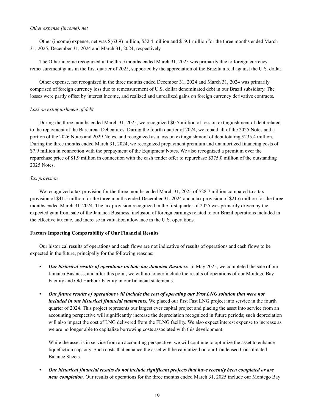 19 Other expense (income), net Other (income) expense, net was $(63.9) million, $52.4 million and $19.1 million for the three months ended March 31, 2025, December 31, 2024 and March 31, 2024, respectively. The Other income recognized in the three months ended March 31, 2025 was primarily due to foreign currency remeasurement gains in the first quarter of 2025, supported by the appreciation of the Brazilian real against the U.S. dollar. Other expense, net recognized in the three months ended December 31, 2024 and March 31, 2024 was primarily comprised of foreign currency loss due to remeasurement of U.S. dollar denominated debt in our Brazil subsidiary. The losses were partly offset by interest income, and realized and unrealized gains on foreign currency derivative contracts. Loss on extinguishment of debt During the three months ended March 31, 2025, we recognized $0.5 million of loss on extinguishment of debt related to the repayment of the Barcarena Debentures. During the fourth quarter of 2024, we repaid all of the 2025 Notes and a portion of the 2026 Notes and 2029 Notes, and recognized as a loss on extinguishment of debt totaling $235.4 million. During the three months ended March 31, 2024, we recognized prepayment premium and unamortized financing costs of $7.9 million in connection with the prepayment of the Equipment Notes. We also recognized a premium over the repurchase price of $1.9 million in connection with the cash tender offer to repurchase $375.0 million of the outstanding 2025 Notes. Tax provision We recognized a tax provision for the three months ended March 31, 2025 of $28.7 million compared to a tax provision of $41.5 million for the three months ended December 31, 2024 and a tax provision of $21.6 million for the three months ended March 31, 2024. The tax provision recognized in the first quarter of 2025 was primarily driven by the expected gain from sale of the Jamaica Business, inclusion of foreign earnings related to our Brazil operations included in the effective tax rate, and increase in valuation allowance in the U.S. operations. Factors Impacting Comparability of Our Financial Results Our historical results of operations and cash flows are not indicative of results of operations and cash flows to be expected in the future, principally for the following reasons: • Our historical results of operations include our Jamaica Business. In May 2025, we completed the sale of our Jamaica Business, and after this point, we will no longer include the results of operations of our Montego Bay Facility and Old Harbour Facility in our financial statements. • Our future results of operations will include the cost of operating our Fast LNG solution that were not included in our historical financial statements. We placed our first Fast LNG project into service in the fourth quarter of 2024. This project represents our largest ever capital project and placing the asset into service from an accounting perspective will significantly increase the depreciation recognized in future periods; such depreciation will also impact the cost of LNG delivered from the FLNG facility. We also expect interest expense to increase as we are no longer able to capitalize borrowing costs associated with this development. While the asset is in service from an accounting perspective, we will continue to optimize the asset to enhance liquefaction capacity. Such costs that enhance the asset will be capitalized on our Condensed Consolidated Balance Sheets. • Our historical financial results do not include significant projects that have recently been completed or are near completion. Our results of operations for the three months ended March 31, 2025 include our Montego Bay