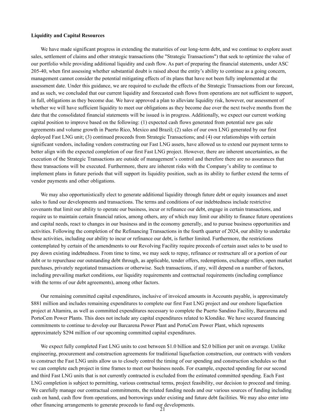 21 Liquidity and Capital Resources We have made significant progress in extending the maturities of our long-term debt, and we continue to explore asset sales, settlement of claims and other strategic transactions (the "Strategic Transactions") that seek to optimize the value of our portfolio while providing additional liquidity and cash flow. As part of preparing the financial statements, under ASC 205-40, when first assessing whether substantial doubt is raised about the entity’s ability to continue as a going concern, management cannot consider the potential mitigating effects of its plans that have not been fully implemented at the assessment date. Under this guidance, we are required to exclude the effects of the Strategic Transactions from our forecast, and as such, we concluded that our current liquidity and forecasted cash flows from operations are not sufficient to support, in full, obligations as they become due. We have approved a plan to alleviate liquidity risk, however, our assessment of whether we will have sufficient liquidity to meet our obligations as they become due over the next twelve months from the date that the consolidated financial statements will be issued is in progress. Additionally, we expect our current working capital position to improve based on the following: (1) expected cash flows generated from potential new gas sale agreements and volume growth in Puerto Rico, Mexico and Brazil; (2) sales of our own LNG generated by our first deployed Fast LNG unit; (3) continued proceeds from Strategic Transactions; and (4) our relationships with certain significant vendors, including vendors constructing our Fast LNG assets, have allowed us to extend our payment terms to better align with the expected completion of our first Fast LNG project. However, there are inherent uncertainties, as the execution of the Strategic Transactions are outside of management’s control and therefore there are no assurances that these transactions will be executed. Furthermore, there are inherent risks with the Company’s ability to continue to implement plans in future periods that will support its liquidity position, such as its ability to further extend the terms of vendor payments and other obligations. We may also opportunistically elect to generate additional liquidity through future debt or equity issuances and asset sales to fund our developments and transactions. The terms and conditions of our indebtedness include restrictive covenants that limit our ability to operate our business, incur or refinance our debt, engage in certain transactions, and require us to maintain certain financial ratios, among others, any of which may limit our ability to finance future operations and capital needs, react to changes in our business and in the economy generally, and to pursue business opportunities and activities. Following the completion of the Refinancing Transactions in the fourth quarter of 2024, our ability to undertake these activities, including our ability to incur or refinance our debt, is further limited. Furthermore, the restrictions contemplated by certain of the amendments to our Revolving Facility require proceeds of certain asset sales to be used to pay down existing indebtedness. From time to time, we may seek to repay, refinance or restructure all or a portion of our debt or to repurchase our outstanding debt through, as applicable, tender offers, redemptions, exchange offers, open market purchases, privately negotiated transactions or otherwise. Such transactions, if any, will depend on a number of factors, including prevailing market conditions, our liquidity requirements and contractual requirements (including compliance with the terms of our debt agreements), among other factors. Our remaining committed capital expenditures, inclusive of invoiced amounts in Accounts payable, is approximately $881 million and includes remaining expenditures to complete our first Fast LNG project and our onshore liquefaction project at Altamira, as well as committed expenditures necessary to complete the Puerto Sandino Facility, Barcarena and PortoCem Power Plants. This does not include any capital expenditures related to Klondike. We have secured financing commitments to continue to develop our Barcarena Power Plant and PortoCem Power Plant, which represents approximately $294 million of our upcoming committed capital expenditures. We expect fully completed Fast LNG units to cost between $1.0 billion and $2.0 billion per unit on average. Unlike engineering, procurement and construction agreements for traditional liquefaction construction, our contracts with vendors to construct the Fast LNG units allow us to closely control the timing of our spending and construction schedules so that we can complete each project in time frames to meet our business needs. For example, expected spending for our second and third Fast LNG units that is not currently contracted is excluded from the estimated committed spending. Each Fast LNG completion is subject to permitting, various contractual terms, project feasibility, our decision to proceed and timing. We carefully manage our contractual commitments, the related funding needs and our various sources of funding including cash on hand, cash flow from operations, and borrowings under existing and future debt facilities. We may also enter into other financing arrangements to generate proceeds to fund our developments.