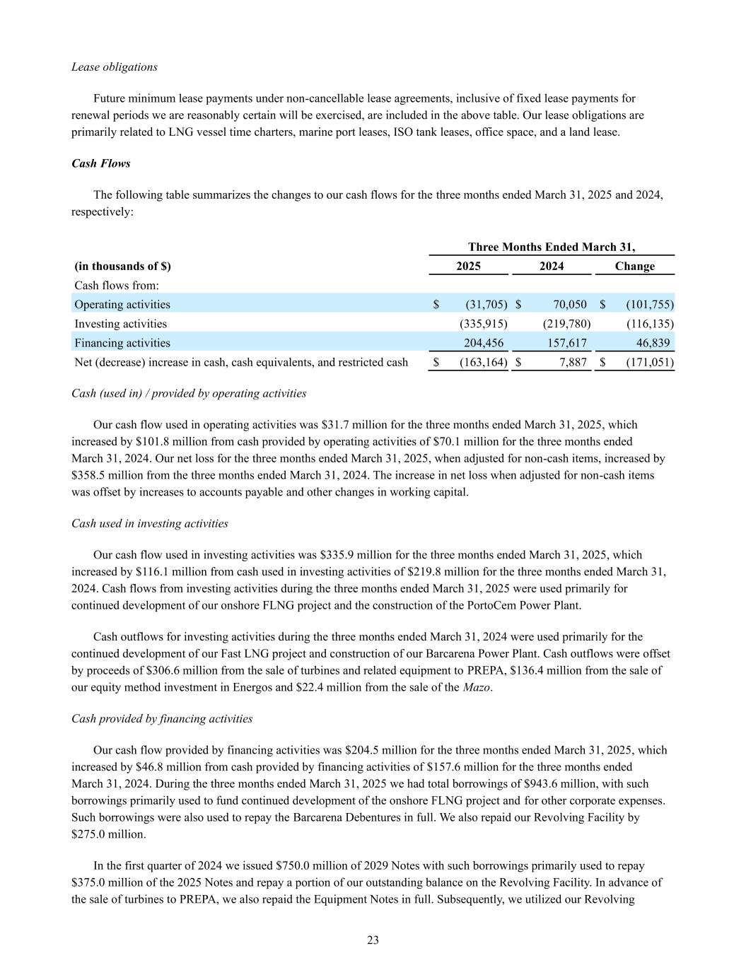 23 Lease obligations Future minimum lease payments under non-cancellable lease agreements, inclusive of fixed lease payments for renewal periods we are reasonably certain will be exercised, are included in the above table. Our lease obligations are primarily related to LNG vessel time charters, marine port leases, ISO tank leases, office space, and a land lease. Cash Flows The following table summarizes the changes to our cash flows for the three months ended March 31, 2025 and 2024, respectively: Three Months Ended March 31, (in thousands of $) 2025 2024 Change Cash flows from: Operating activities $ (31,705) $ 70,050 $ (101,755) Investing activities (335,915) (219,780) (116,135) Financing activities 204,456 157,617 46,839 Net (decrease) increase in cash, cash equivalents, and restricted cash $ (163,164) $ 7,887 $ (171,051) Cash (used in) / provided by operating activities Our cash flow used in operating activities was $31.7 million for the three months ended March 31, 2025, which increased by $101.8 million from cash provided by operating activities of $70.1 million for the three months ended March 31, 2024. Our net loss for the three months ended March 31, 2025, when adjusted for non-cash items, increased by $358.5 million from the three months ended March 31, 2024. The increase in net loss when adjusted for non-cash items was offset by increases to accounts payable and other changes in working capital. Cash used in investing activities Our cash flow used in investing activities was $335.9 million for the three months ended March 31, 2025, which increased by $116.1 million from cash used in investing activities of $219.8 million for the three months ended March 31, 2024. Cash flows from investing activities during the three months ended March 31, 2025 were used primarily for continued development of our onshore FLNG project and the construction of the PortoCem Power Plant. Cash outflows for investing activities during the three months ended March 31, 2024 were used primarily for the continued development of our Fast LNG project and construction of our Barcarena Power Plant. Cash outflows were offset by proceeds of $306.6 million from the sale of turbines and related equipment to PREPA, $136.4 million from the sale of our equity method investment in Energos and $22.4 million from the sale of the Mazo. Cash provided by financing activities Our cash flow provided by financing activities was $204.5 million for the three months ended March 31, 2025, which increased by $46.8 million from cash provided by financing activities of $157.6 million for the three months ended March 31, 2024. During the three months ended March 31, 2025 we had total borrowings of $943.6 million, with such borrowings primarily used to fund continued development of the onshore FLNG project and for other corporate expenses. Such borrowings were also used to repay the Barcarena Debentures in full. We also repaid our Revolving Facility by $275.0 million. In the first quarter of 2024 we issued $750.0 million of 2029 Notes with such borrowings primarily used to repay $375.0 million of the 2025 Notes and repay a portion of our outstanding balance on the Revolving Facility. In advance of the sale of turbines to PREPA, we also repaid the Equipment Notes in full. Subsequently, we utilized our Revolving