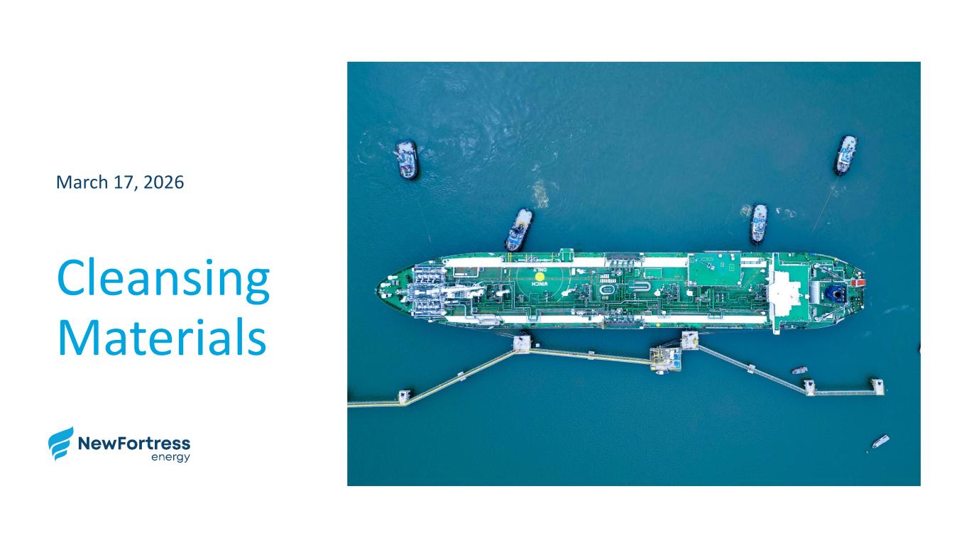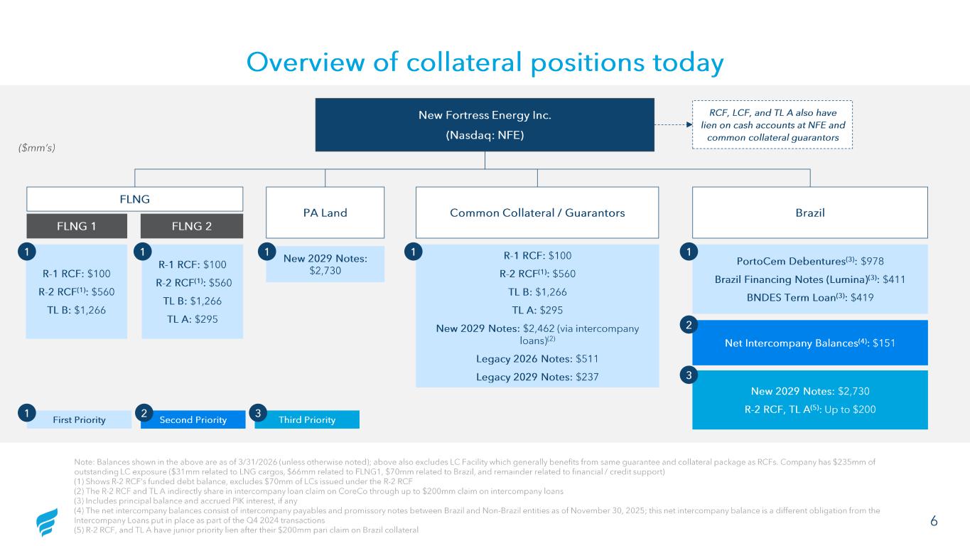 Overview of collateral positions today Note: Balances shown in the above are as of 3/31/2026 (unless otherwise noted); above also excludes LC Facility which generally benefits from same guarantee and collateral package as RCFs. Company has $235mm of outstanding LC exposure ($31mm related to LNG cargos, $66mm related to FLNG1, $70mm related to Brazil, and remainder related to financial / credit support)(1) Shows R-2 RCF’s funded debt balance, excludes $70mm of LCs issued u der the R-2 RCF2 T e R-2 RCF and TL A indir c ly share in intercompany loan claim on CoreCo through up to $200mm claim on intercompany loans3 Includes principal bala ce and acc u d PIK int rest, if a y4 net inter ompa y bal nces o si t of intercompany pay ble and pr miss ry notes between Braz l nd Non-Brazil e tities as of Nove ber 30, 2025; his net intercompany balance is a different obligation fro the In ercompany Loan put in place as part of the Q4 2024 transactions5 R-2 RCF, and TL A h v junior prio ity lien af their $200mm pari claim on Brazil c llateral Note: Balances shown in the above are as of 3/31/2026 (unless otherwise noted); above also excludes LC Facility which general ly benefits from same guarantee and collateral package as RCFs. Company has $235mm of outstanding LC exposure ($31mm related to LNG cargos, $66mm related to FLNG1, $70mm related to Brazil, and remainder related to financial / credit support) (1) Shows R -2 RCF’s funded debt balance, excludes $70mm of LCs issued under the R -2 RCF (2) The R -2 RCF and TL A indirectly share in intercompany loan claim on CoreCo through up to $200mm claim on intercompany loans (3) Includes principal balance and accrued PIK interest, if any (4) The net intercompany balances consist of intercompany payables and promissory notes between Brazil and Non -Brazil entities a s of November 30, 2025; this net intercompany balance is a different obligation from the Intercompany Loans put in place as part of the Q4 2024 transactions (5) R -2 RCF, and TL A have junior priority lien after their $200mm pari claim on Brazil collateral New Fortress Energy Inc. (Nasdaq: NFE) R-1 RCF: $100 R-2 RCF (1): $560 TL B: $1,266 R-1 RCF: $100 R-2 RCF (1): $560 TL B: $1,266 TL A: $295 FLNG FLNG 1 FLNG 2 1 1 Common Collateral / Guarantors R-1 RCF: $100 R-2 RCF (1): $560 TL B: $1,266 TL A: $295 New 2029 Notes: $2,462 (via intercompany loans) (2) Legacy 2026 Notes: $511 Legacy 2029 Notes: $237 1 Brazil PortoCem Debentures (3): $978 Brazil Financing Notes (Lumina )(3): $411 BNDES Term Loan (3): $419 New 2029 Notes: $2,730 R-2 RCF, TL A (5): Up to $200 1 3 First Priority Second Priority 1 2 ($mm’s) RCF, LCF, and TL A also have lien on cash accounts at NFE and common collateral guarantors Third Priority 3 Net Intercompany Balances (4): $151 2 PA Land New 2029 Notes: $2,730 1 6