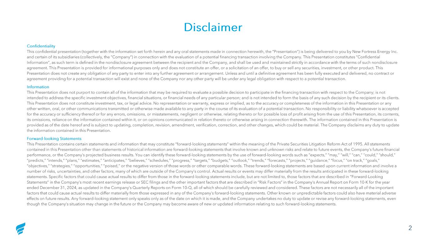 Disclaimer Confidentiality This confidential presentation (together with the information set forth herein and any oral statements made in connection her ewi th, the “Presentation”) is being delivered to you by New Fortress Energy Inc. and certain of its subsidiaries (collectively, the “Company”) in connection with the evaluation of a potential financing tran sac tion involving the Company. This Presentation constitutes “Confidential Information”, as such term is defined in the nondisclosure agreement between the recipient and the Company, and shall be used an d maintained strictly in accordance with the terms of such nondisclosure agreement. This Presentation is provided for informational purposes only and does not constitute an offer, or a solicitation of an offer, to buy or sell any securities, investment, or other product. This Presentation does not create any obligation of any party to enter into any further agreement or arrangement. Unless and until a definitive agreement has been fully executed and delivered, no contract or agreement providing for a potential transaction will exist and none of the Company nor any other party will be under any lega l o bligation with respect to a potential transaction. Information This Presentation does not purport to contain all of the information that may be required to evaluate a possible decision to par ticipate in the financing transaction with respect to the Company; is not intended to address the specific investment objectives, financial situations, or financial needs of any particular person; an d i s not intended to form the basis of any such decision by the recipient or its clients. This Presentation does not constitute investment, tax, or legal advice. No representation or warranty, express or implied, as to the accuracy or completeness of the information in this Presentation or any other written, oral, or other communications transmitted or otherwise made available to any party in the course of its evalua tion of a potential transaction. No responsibility or liability whatsoever is accepted for the accuracy or sufficiency thereof or for any errors, omissions, or misstatements, negligent or otherwise, relating ther eto or for possible loss of profit arising from the use of this Presentation, its contents, its omissions, reliance on the information contained within it, or on opinions communicated in relation thereto or otherwise arising in connection therewith. The information contained in this Presentation is provided as of the date hereof and is subject to updating, completion, revision, amendment, verification, correction, and oth er changes, which could be material. The Company disclaims any duty to update the information contained in this Presentation. Forward -looking Statements This Presentation contains certain statements and information that may constitute “forward -looking statements” within the meanin g of the Private Securities Litigation Reform Act of 1995. All statements contained in this Presentation other than statements of historical information are forward -looking statements that involve known and unknown risks and relate t o future events, the Company’s future financial performance, or the Company’s projected business results. You can identify these forward -looking statements by the use of forwar d -looking words such as “expects,” “may,” “will,” “can,” “could,” “should,” “predicts,” “intends,” “plans,” “estimates,” “anticipates,” “believes,” “schedules,” “progress,” “targets,” “budgets,” “outlo ok, ” “trends,” “forecasts,” “projects,” “guidance,” “focus,” “on track,” “goals,” “objectives,” “strategies,” “opportunities,” “poised,” or the negative version of those words or other comparable words. Thes e forward -looking statements are based upon current information and involve a number of risks, uncertainties, and other factors, many of which are outside of the Company’s control. Actual results or even ts may differ materially from the results anticipated in these forward -looking statements. Specific factors that could cause actual results to differ from those in the forward -looking statements include, but are not limited to, those factors that are described in “Forward -Looking Statements” in the Company’s most recent earnings release or SEC filings and the other important factors that are described i n “Risk Factors” in the Company’s Annual Report on Form 10 -K for the year ended December 31, 2024, as updated in the Company’s Quarterly Reports on Form 10 -Q, all of which should be carefully reviewed a nd considered. These factors are not necessarily all of the important factors that could cause actual results to differ materially from those expressed in any of the Company’s forward -looking statem ents. Other known or unpredictable factors could also have material adverse effects on future results. Any forward -looking statement only speaks only as of the date on which it is made, and the Company un dertakes no duty to update or revise any forward -looking statements, even though the Company’s situation may change in the future or the Company may become aware of new or updated information relatin g t o such forward -looking statements. 2