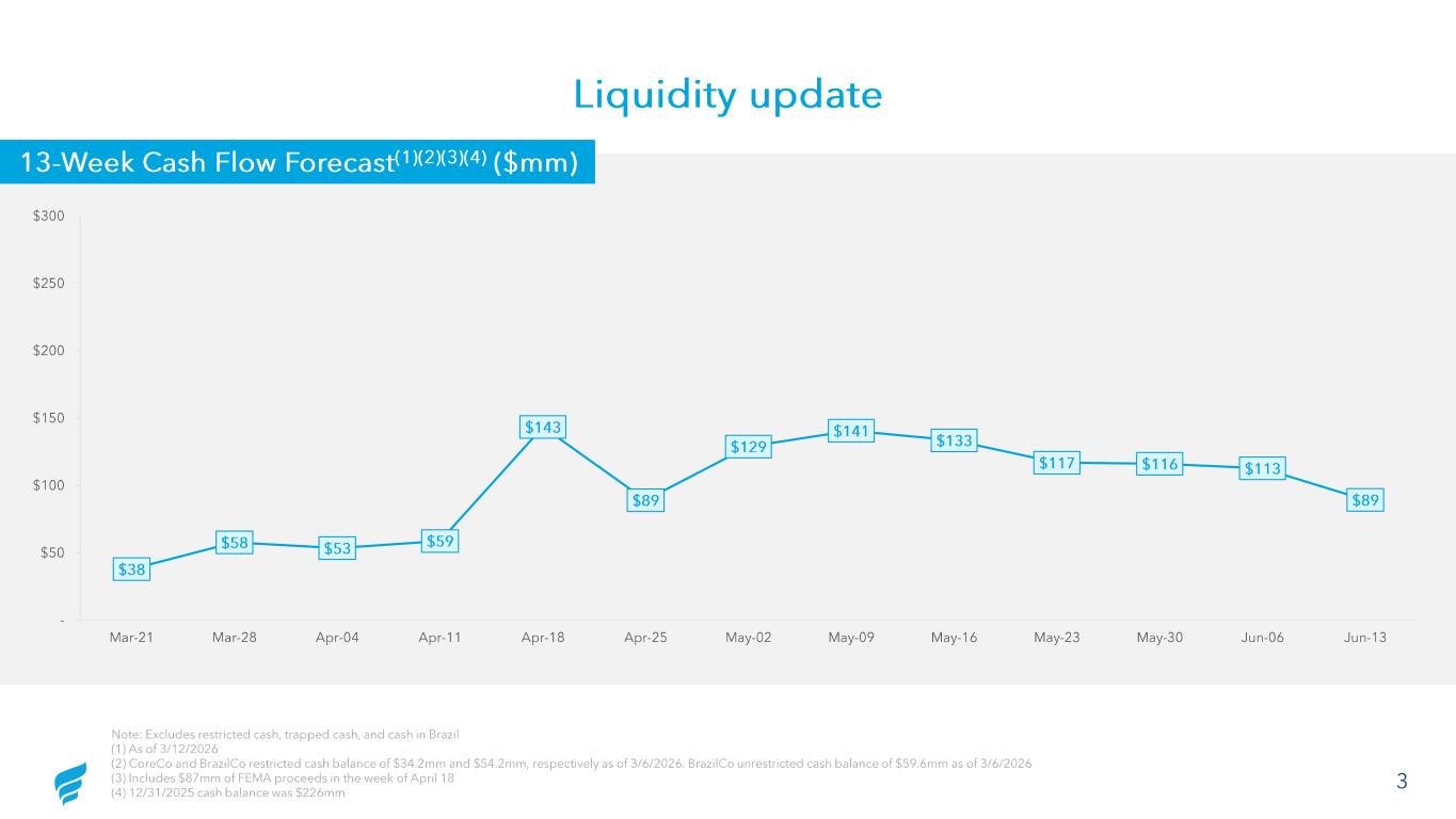 Liquidity update Note: Excludes restricted cash, trapped cash, and cash in Brazil(1) As of 3/12/20262 CoreCo and BrazilCo restricted cash balance of $34.2mm and $54.2mm, respectively as of 3/6/2026. BrazilCo unrestricted cash balance of $59.6mm as of 3/6/20263 Includes $87mm of FEMA pro eeds in t e week of April 184 12/31/2025 c sh balance was $226mm Note: Excludes restricted cash, trapped cash, and cash in Brazil (1) As of 3/12/2026 (2) CoreCo and BrazilCo restricted cash balance of $34.2mm and $54.2mm, respectively as of 3/6/2026. BrazilCo unrestricted cash balance of $59.6mm as of 3/6/2026 (3) Includes $87mm of FEMA proceeds in the week of April 18 (4) 12/31/2025 cash balance was $226mm $38 $58 $53 $59 $143 $89 $129 $141 $133 $117 $116 $113 $89 - $50 $100 $150 $200 $250 $300 Mar-21 Mar-28 Apr-04 Apr-11 Apr-18 Apr-25 May-02 May-09 May-16 May-23 May-30 Jun-06 Jun-13 13 -Week Cash Flow Forecast (1)(2)(3)(4) ($mm) 3