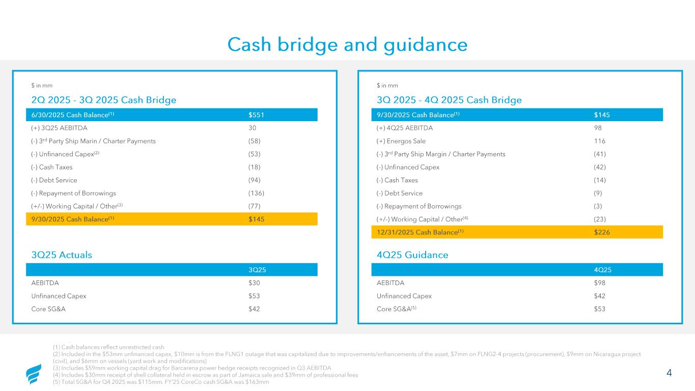 Cash bridge and guidance (1) Cash balances reflect unrestricted cash2 Included i the $53mm unfinanced capex, $10mm is from the FLNG1 outage that was capitalized due to improvements/enhancements of the asset, $7mm on FLNG2-4 projects (procurement), $9mm on Nicaragua project (civil), and $6mm on vessels (yard work and modifications)3 s $59mm worki g capi al dr g for Barcarena power dge receip s r cognized in Q3 AEBITDA4 30 r eipt o shell collateral held in escr as part of Jamaica sale and $39mm of professional fees 5 Total SGA for Q4 2025 wa $115mm. FY’25 Co Co cash SGA was $ 63mm (1) Cash balances reflect unrestricted cash (2) Included in the $53mm unfinanced capex, $10mm is from the FLNG1 outage that was capitalized due to improvements/enhanceme nts of the asset, $7mm on FLNG2 -4 projects (procurement), $9mm on Nicaragua project (civil), and $6mm on vessels (yard work and modifications) (3) Includes $59mm working capital drag for Barcarena power hedge receipts recognized in Q3 AEBITDA (4) Includes $30mm receipt of shell collateral held in escrow as part of Jamaica sale and $39mm of professional fees (5) Total SG&A for Q4 2025 was $115mm. FY’25 CoreCo cash SG&A was $163mm 6/30/2025 Cash Balance (1) $551 (+) 3Q25 AEBITDA 30 (-) 3 rd Party Ship Marin / Charter Payments (58) (-) Unfinanced Capex (2) (53) (-) Cash Taxes (18) (-) Debt Service (94) (-) Repayment of Borrowings (136) (+/ -) Working Capital / Other (3) (77) 9/30/2025 Cash Balance (1) $145 $ in mm 2Q 2025 - 3Q 2025 Cash Bridge 3Q25 AEBITDA $30 Unfinanced Capex $53 Core SG&A $42 3Q25 Actuals 9/30/2025 Cash Balance (1) $145 (+) 4Q25 AEBITDA 98 (+) Energos Sale 116 (-) 3 rd Party Ship Margin / Charter Payments (41) (-) Unfinanced Capex (42) (-) Cash Taxes (14) (-) Debt Service (9) (-) Repayment of Borrowings (3) (+/ -) Working Capital / Other (4) (23) 12/31/2025 Cash Balance (1) $226 $ in mm 3Q 2025 - 4Q 2025 Cash Bridge 4Q25 AEBITDA $98 Unfinanced Capex $42 Core SG&A (5) $53 4Q25 Guidance 4