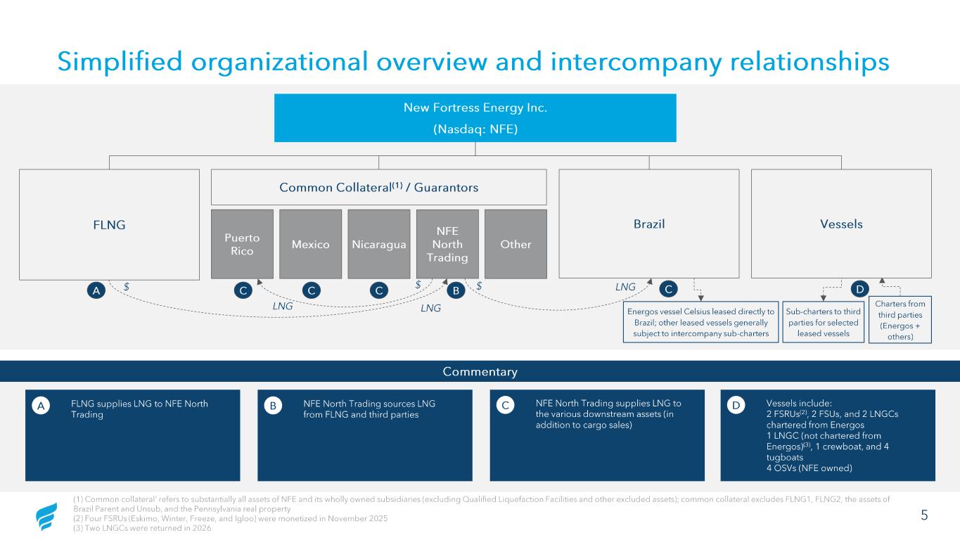 Simplified organizational overview and intercompany relationships (1) Common collateral' refers to substantially all assets of NFE and its wholly owned subsidiaries (excluding Qualified Liquefaction Facilities and other excluded assets); common collateral excludes FLNG1, FLNG2, the assets of Brazil Parent and Unsub, and the Pennsylvania real property2 F ur FSRUs (Eskimo, Winter, Freeze, nd Igloo) were monetized in N vember 20253 Two LNGC were returned in 2026 (1) Common collateral' refers to substantially all assets of NFE and its wholly owned subsidiaries (excluding Qualified Lique fac tion Facilities and other excluded assets); common collateral excludes FLNG1, FLNG2, the assets of Brazil Parent and Unsub, and the Pennsylvania real property (2) Four FSRUs (Eskimo, Winter, Freeze, and Igloo) were monetized in November 2025 (3) Two LNGCs were returned in 2026 A • FLNG supplies LNG to NFE North Trading B • NFE North Trading sources LNG from FLNG and third parties C • NFE North Trading supplies LNG to the various downstream assets (in addition to cargo sales) D • Vessels include: • 2 FSRUs (2), 2 FSUs, and 2 LNGCs chartered from Energos • 1 LNGC (not chartered from Energos )(3), 1 crewboat , and 4 tugboats • 4 OSVs (NFE owned) Commentary New Fortress Energy Inc. (Nasdaq: NFE) Mexico Nicaragua FLNG Common Collateral (1) / Guarantors A B C D LNG $ $ LNG LNG $ C C C Sub -charters to third parties for selected leased vessels Charters from third parties (Energos + others) Other NFE North Trading Puerto Rico Energos vessel Celsius leased directly to Brazil; other leased vessels generally subject to intercompany sub -charters VesselsBrazil 5