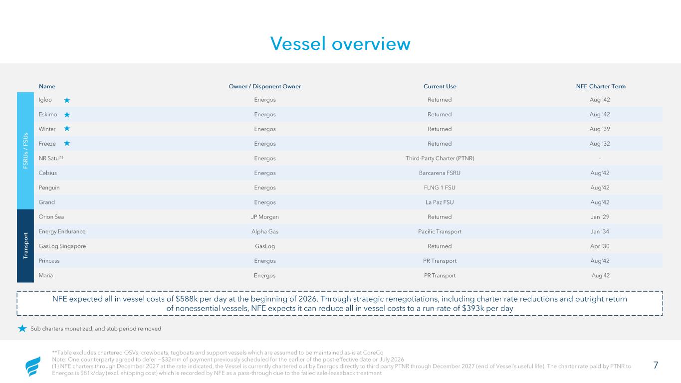 Vessel overview **Table excludes chartered OSVs, crewboats, tugboats and support vessels which are assumed to be maintained as-is at CoreCoNote: One ounterp y agreed to defer ~$32mm of payment reviously scheduled for the earlier of the post-effective date or July 2026(1) NFE charters through Dec mber 2027 at the rate indicated, the Vessel is currently chartered out by Energos directly to hi d party PTNR through December 2027 (end of Vessel’s useful life). The charter rate paid by PTNR to Energos is $81k/day (excl. shipping cost) which is recorded by NFE as a pass-through due to the failed sale-leaseback treatment **Table excludes chartered OSVs, crewboats , tugboats and support vessels which are assumed to be maintained as -is at CoreCo Note: One counterparty agreed to defer ~$32mm of payment previously scheduled for the earlier of the post -effective date or July 2026 (1) NFE charters through December 2027 at the rate indicated, the Vessel is currently chartered out by Energos directly to third party PTNR through December 2027 (end of Vessel’s useful life). The charter rate paid by PTNR to Energos is $81k/day (excl. shipping cost) which is recorded by NFE as a pass -through due to the failed sale -leaseback treatment Name Owner / Disponent Owner Current Use NFE Charter Term FS R U s / FS U s Igloo Energos Returned Aug '42 Eskimo Energos Returned Aug '42 Winter Energos Returned Aug '39 Freeze Energos Returned Aug '32 NR Satu (1) Energos Third -Party Charter (PTNR) - Celsius Energos Barcarena FSRU Aug'42 Penguin Energos FLNG 1 FSU Aug'42 Grand Energos La Paz FSU Aug'42 Tr an sp o rt Orion Sea JP Morgan Returned Jan '29 Energy Endurance Alpha Gas Pacific Transport Jan '34 GasLog Singapore GasLog Returned Apr '30 Princess Energos PR Transport Aug'42 Maria Energos PR Transport Aug'42 NFE expected all in vessel costs of $588k per day at the beginning of 2026. Through strategic renegotiations, including chart er rate reductions and outright return of nonessential vessels, NFE expects it can reduce all in vessel costs to a run -rate of $393k per day Sub charters monetized, and stub period removed 7