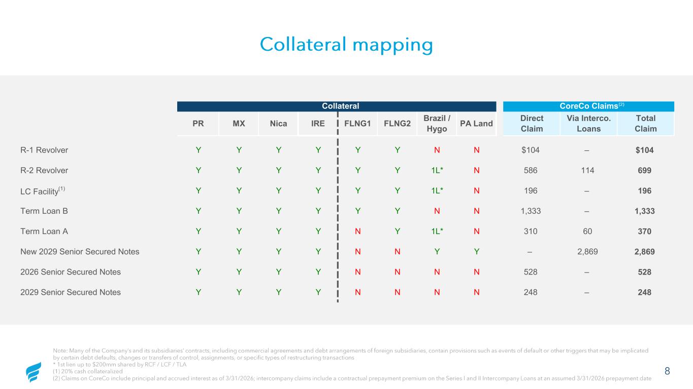 Collateral mapping Note: Many of the Company’s and its subsidiaries’ contracts, including commercial agreements and debt arrangements of foreign subsidiaries, contain provisions such as events of default or other triggers that may be implicated by certain debt defaults, changes or transfers of control, assignments, or specific types of restructuring transactions* 1st lien up to $200m shared by RCF / LCF / TLA(1) 20% cash collateralized2 Claims on CoreCo include principal and accru d interest as of 3/31/2026; intercompany claims include co tractual prepayment premium on the Series I and II Intercompany Loans at an assumed 3/31/2026 prepay ent date Note: Many of the Company’s and its subsidiaries’ contracts, including commercial agreements and debt arrangements of foreign su bsidiaries, contain provisions such as events of default or other triggers that may be implicated by certain debt defaults, changes or transfers of control, assignments, or specific types of restructuring transactions * 1st lien up to $200mm shared by RCF / LCF / TLA (1) 20% cash collateralized (2) Claims on CoreCo include principal and accrued interest as of 3/31/2026; intercompany claims include a contractual prepayment premium on the S eries I and II Intercompany Loans at an assumed 3/31/2026 prepayment date Collateral CoreCo Claims R-1 Revolver Y Y Y Y Y Y N N $104 – $104 R-2 Revolver Y Y Y Y Y Y 1L* N 586 114 699 LC Facility (1) Y Y Y Y Y Y 1L* N 196 – 196 Term Loan B Y Y Y Y Y Y N N 1,333 – 1,333 Term Loan A Y Y Y Y N Y 1L* N 310 60 370 New 2029 Senior Secured Notes Y Y Y Y N N Y Y – 2,869 2,869 2026 Senior Secured Notes Y Y Y Y N N N N 528 – 528 2029 Senior Secured Notes Y Y Y Y N N N N 248 – 248 Direct Claim Via Interco. Loans Total Claim MXPR PA Land Brazil / Hygo FLNG2FLNG1IRENica (2) 8