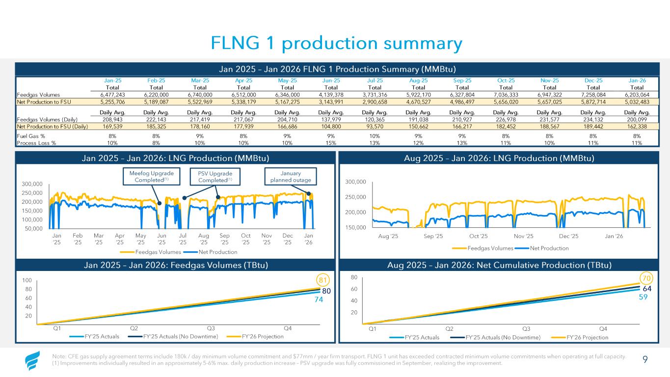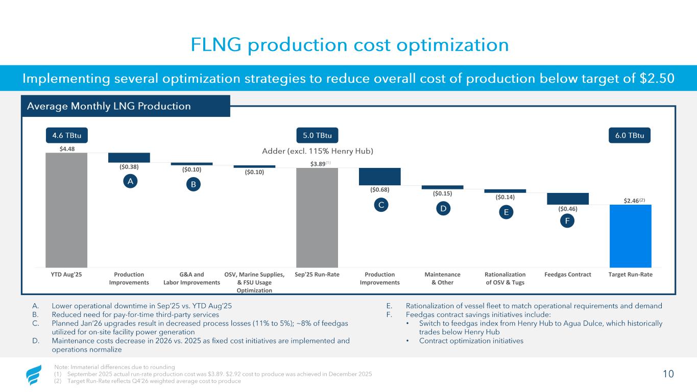 9Note: CFE gas supply agreement terms include 180k / day minimum volume commitment and $77mm / year firm transport. FLNG 1 uni t has exceeded contracted minimum volume commitments when operating at full capacity. (1) Improvements individually resulted in an approximately 5 -6% max. daily production increase – PSV upgrade was fully commissio ned in September, realizing the improvement. FLNG 1 production summary Jan-25 Feb-25 Mar-25 Apr-25 May-25 Jun-25 Jul-25 Aug-25 Sep-25 Oct-25 Nov-25 Dec-25 Jan-26 Total Total Total Total Total Total Total Total Total Total Total Total Total Feedgas Volumes 6,477,243 6,220,000 6,740,000 6,512,000 6,346,000 4,139,378 3,731,316 5,922,170 6,327,804 7,036,333 6,947,322 7,258,084 6,203,064 Net Production to FSU 5,255,706 5,189,087 5,522,969 5,338,179 5,167,275 3,143,991 2,900,658 4,670,527 4,986,497 5,656,020 5,657,025 5,872,714 5,032,483 Daily Avg. Daily Avg. Daily Avg. Daily Avg. Daily Avg. Daily Avg. Daily Avg. Daily Avg. Daily Avg. Daily Avg. Daily Avg. Daily Avg. Daily Avg. Feedgas Volumes (Daily) 208,943 222,143 217,419 217,067 204,710 137,979 120,365 191,038 210,927 226,978 231,577 234,132 200,099 Net Production to FSU (Daily) 169,539 185,325 178,160 177,939 166,686 104,800 93,570 150,662 166,217 182,452 188,567 189,442 162,338 Fuel Gas % 8% 8% 9% 8% 9% 9% 10% 9% 9% 8% 8% 8% 8% Process Loss % 10% 8% 10% 10% 10% 15% 13% 12% 13% 11% 10% 11% 11% Jan 2025 – Jan 2026 FLNG 1 Production Summary (MMBtu) 50,000 100,000 150,000 200,000 250,000 300,000 Feedgas Volumes Net Production Jan ’25 Feb ’25 Mar ’25 Apr ’25 May ’25 Jun ’25 Jul ’25 Aug ’25 Sep ’25 Oct ’25 Nov ’25 Dec ’25 Jan ’26 January planned outage PSV Upgrade Completed (1) Meefog Upgrade Completed (1) Jan 2025 – Jan 2026: LNG Production (MMBtu) 20 40 60 80 100 FY'25 Actuals FY'25 Actuals (No Downtime) FY'26 Projection 80 74 Q1 Q4Q2 Q3 81 Aug 2025 – Jan 2026: LNG Production (MMBtu) 150,000 200,000 250,000 300,000 A u g -2 5 A u g -2 5 A u g -2 5 A u g -2 5 A u g -2 5 S e p -2 5 S e p -2 5 S e p -2 5 S e p -2 5 O c t- 2 5 O c t- 2 5 O c t- 2 5 O c t- 2 5 O c t- 2 5 N o v -2 5 N o v -2 5 N o v -2 5 N o v -2 5 D e c -2 5 D e c -2 5 D e c -2 5 D e c -2 5 J a n -2 6 J a n -2 6 J a n -2 6 J a n -2 6 J a n -2 6 Feedgas Volumes Net Production Sep ’25 Dec ’25Nov ’25Oct ’25Aug ’25 Jan ’26 20 40 60 80 Q 1 Q 2 Q 3 Q 4FY'25 Actuals FY'25 Actuals (No Downtime) FY'26 Projection Q1 Q4Q2 Q3 64 59 70 $0.46 – need to clarify this to Chris w/ Sam Jan 2025 – Jan 2026: Feedgas Volumes ( TBtu ) Aug 2025 – Jan 2026: Net Cumulative Production ( TBtu )