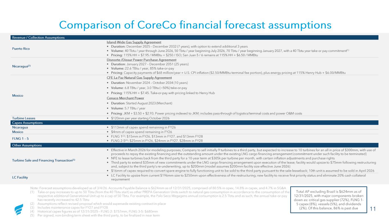 11 Comparison of CoreCo financial forecast assumptions Total AP excluding Brazil is $624mm as of 12/31/2025, with major components broken down as: critical gas supplier (72%), FLNG 1 - 5 capex (8%), vessels (5%), and dividends (2%). Of this balance, 86% is past due Revenue / Collection Assumptions Puerto Rico Island -Wide Gas Supply Agreement • Duration: December 2025 – December 2032 (7 years), with option to extend additional 3 years • Volume: 40 Tbtu / year through June 2026, 50 Tbtu / year beginning July 2026, 70 Tbtu / year beginning January 2027, with a 40 Tbtu year take or pay commitment (1) • Pricing: 115% HH + $7.95 / MMBtu + $250 / ISO; San Juan 5 / 6 remains at 115% HH + $6.50 / MMBtu Nicaragua (2) Disnorte /Dissur Power Purchase Agreement • Duration : January 2027 – December 2051 (25 years) • Volume: 22.6 TBtu / year, 85% take -or-pay • Pricing : Capacity payments of $68 million/year + U.S. CPI inflation ($2.50/MMBtu terminal fee portion), plus energy pricing at 115% Hen ry Hub + $6.00/MMBtu Mexico CFE La Paz Natural Gas Supply Agreement • Duration : November 2024 – October 2034 (10 years) • Volume : 6.8 TBtu / year, 3.0 TBtu (~50%) take -or-pay • Pricing : 115% HH + $7.45. Take -or-pay with pricing linked to Henry Hub Cenace Merchant Power • Duration : Started August 2023 (Merchant) • Volume : 5.7 TBtu / year • Pricing : JKM + $3.50 + $2.93. Power pricing indexed to JKM; includes pass -through of logistics/terminal costs and power O&M costs Turbine Leases • $120mm per year starting October 2026 Capex Assumptions Nicaragua • $113mm of capex spend remaining in FY26 Mexico • $4mm of capex spend remaining in FY26 FLNG 1 – 5 • FLNG 1 (3): $15mm in FY26, $13mm in FY27, and $13mm FY28 • FLNG 2 -5 (4): $25mm in FY26, $24mm in FY27, $28mm in FY28 Other Assumptions Turbine Sale and Financing Transaction (5) • Effective in March 2026 for modeling purposes; Company to sell initially 9 turbines to a third party, but expected to increas e to 10 turbines for an all in price of $300mm, with use of proceeds to repay the existing financing and the outstanding amount under the existing LNG cargo financing arrangement (commi tme nt under such facility to be terminated) • NFE to lease turbines back from the third party for a 10 -year term at $305k per turbine per month, with certain inflation adjust ments and purchase rights • Third party to extend $35mm of new commitments under the LNG cargo financing arrangement upon execution of the lease; facilit y would upsize to $75mm following restructuring and, subject to the third party’s re -underwriting, up to $200mm (model assumes $200mm facility size effective June 2026) • $16mm of capex required to convert spare engine to fully functioning unit to be sold to the third party pursuant to the sale -lea seback; 10th unit is assumed to be sold in April 2026 LC Facility • LC Facility to upsize from current $196mm size to $250mm upon effectiveness of the restructuring; new facility to receive fir st priority status and eliminate 20% cash collateral requirement Note: Forecast assumptions developed as of 3/4/26. Accounts Payable Balance is $624mm as of 12/31/2025, comprised of 80.5% in opex , 14.8% in capex, and 4.7% in SG&A (1) Take -or-pay increases to up to 50 Tbtu (from the 40 Tbtu start) as other PREPA Generation Units switch to natural gas consumption in accordance to the consumption of the respective additional Generational Unit up to a cap of 50 Tbtu . For example, the Palo Seco Megagens annual consumption is 2.5 Tbtu and as such, the annual take -or-pay has recently increased to 42.5 Tbtu (2) Assumptions reflect revised proposal which would supersede existing contract in place (3) Includes maintenance capex for FY27 and FY28 (4) Historical capex figures as of 12/31/2025 – FLNG 2: $757mm, FLNG 3 -5: $680mm (5) Per signed, non -binding term sheet with the third party, to be finalized in near term