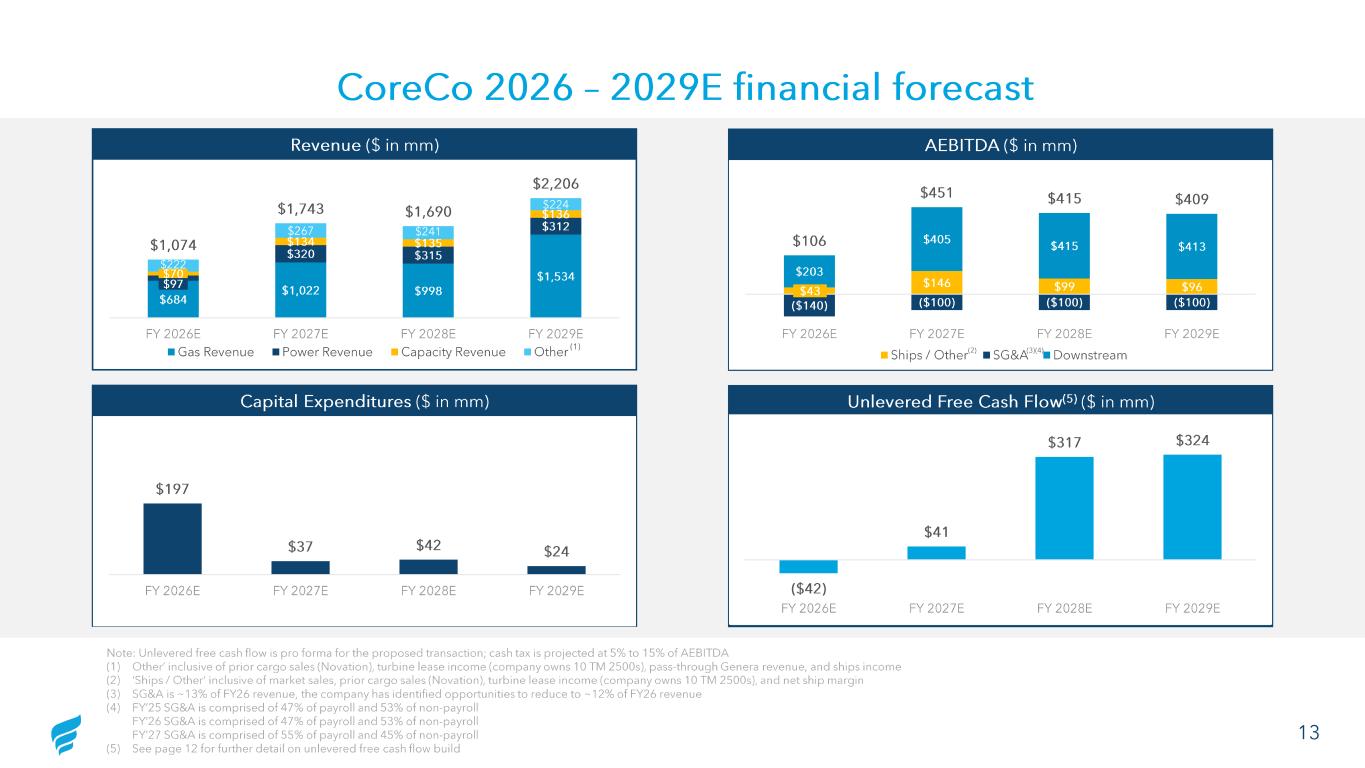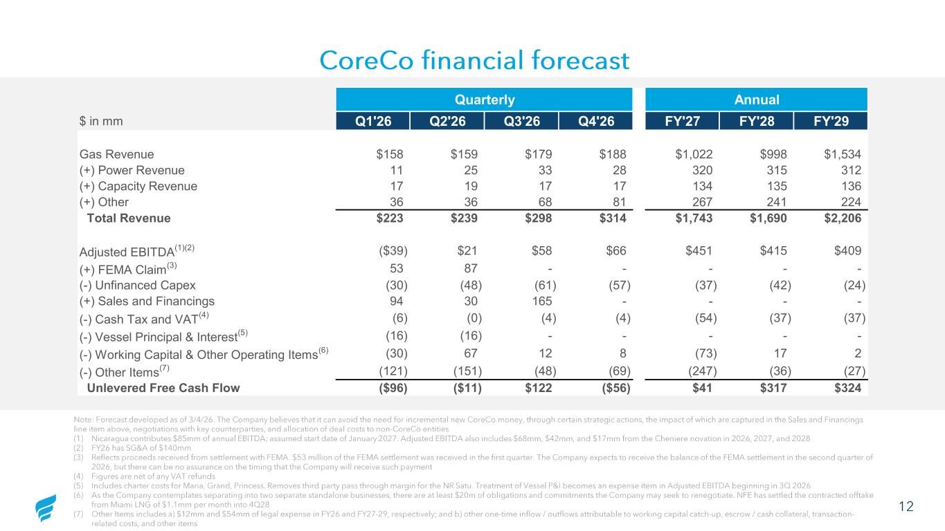 12 CoreCo financial forecast Chris needs a backup page for p12 for what’s in other Note: Forecast developed as of 3/4/26. The Company believes that it can avoid the need for incremental new CoreCo money, through certain strategic actions, the impact of which are captured in the Sales and Financings line item above, negotiations with key counterparties, and allocation of deal costs to non -CoreCo entities (1) Nicaragua contributes $85mm of annual EBITDA; assumed start date of January 2027. Adjusted EBITDA also includes $68mm, $42mm, an d $17mm from the Cheniere novation in 2026, 2027, and 2028 (2) FY26 has SG&A of $140mm (3) Reflects proceeds received from settlement with FEMA. $53 million of the FEMA settlement was received in the first quarter. The Company expects to receive the balance o f the FEMA settlement in the second quarter of 2026, but there can be no assurance on the timing that the Company will receive such payment (4) Figures are net of any VAT refunds (5) Includes charter costs for Maria, Grand, Princess. Removes third party pass through margin for the NR Satu. Treatment of Vess el P&I becomes an expense item in Adjusted EBITDA beginning in 3Q 2026 (6) As the Company contemplates separating into two separate standalone businesses, there are at least $20m of obligations and co mmi tments the Company may seek to renegotiate. NFE has settled the contracted offtake from Miami LNG of $1.1mm per month into 4Q28 (7) Other Items includes a) $12mm and $54mm of legal expense in FY26 and FY27 -29, respectively; and b) other one -time inflow / outfl ows attributable to working capital catch -up, escrow / cash collateral, transaction - related costs, and other items Quarterly Annual $ in mm Q1'26 Q2'26 Q3'26 Q4'26 FY'27 FY'28 FY'29 Gas Revenue $158 $159 $179 $188 $1,022 $998 $1,534 (+) Power Revenue 11 25 33 28 320 315 312 (+) Capacity Revenue 17 19 17 17 134 135 136 (+) Other 36 36 68 81 267 241 224 Total Revenue $223 $239 $298 $314 $1,743 $1,690 $2,206 Adjusted EBITDA (1)(2) ($39) $21 $58 $66 $451 $415 $409 (+) FEMA Claim (3) 53 87 - - - - - (-) Unfinanced Capex (30) (48) (61) (57) (37) (42) (24) (+) Sales and Financings 94 30 165 - - - - (-) Cash Tax and VAT (4) (6) (0) (4) (4) (54) (37) (37) (-) Vessel Principal & Interest (5) (16) (16) - - - - - (-) Working Capital & Other Operating Items (6) (30) 67 12 8 (73) 17 2 (-) Other Items (7) (121) (151) (48) (69) (247) (36) (27) Unlevered Free Cash Flow ($96) ($11) $122 ($56) $41 $317 $324
