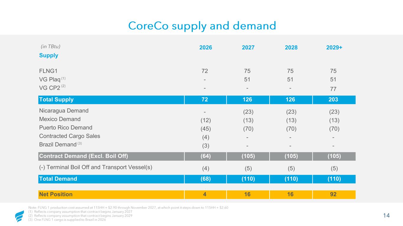 13 CoreCo 2026 – 2029E financial forecast Note: Unlevered free cash flow is pro forma for the proposed transaction; cash tax is projected at 5% to 15% of AEBITDA (1) Other’ inclusive of prior cargo sales (Novation), turbine lease income (company owns 10 TM 2500s), pass -through Genera revenue, and ships income (2) ‘Ships / Other’ inclusive of market sales, prior cargo sales (Novation), turbine lease income (company owns 10 TM 2500s), and ne t ship margin (3) SG&A is ~13% of FY26 revenue, the company has identified opportunities to reduce to ~12% of FY26 revenue (4) FY’25 SG&A is comprised of 47% of payroll and 53% of non -payroll FY’26 SG&A is comprised of 47% of payroll and 53% of non -payroll FY’27 SG&A is comprised of 55% of payroll and 45% of non -payroll (5) See page 12 for further detail on unlevered free cash flow build $684 $1,022 $998 $1,534 $97 $320 $315 $312 $70 $134 $135 $136 $222 $267 $241 $224 $1,074 $1,743 $1,690 $2,206 FY 2026E FY 2027E FY 2028E FY 2029E Gas Revenue Power Revenue Capacity Revenue Other Revenue ($ in mm) $43 $146 $99 $96 ($140) ($100) ($100) ($100) $203 $405 $415 $413 $106 $451 $415 $409 FY 2026E FY 2027E FY 2028E FY 2029E Ships / Other SG&A Downstream AEBITDA ($ in mm) $197 $37 $42 $24 FY 2026E FY 2027E FY 2028E FY 2029E Capital Expenditures ($ in mm) Unlevered Free Cash Flow (5) ($ in mm) (1) (2) (3)(4) ($42) $41 $317 $324 FY 2026E FY 2027E FY 2028E FY 2029E
