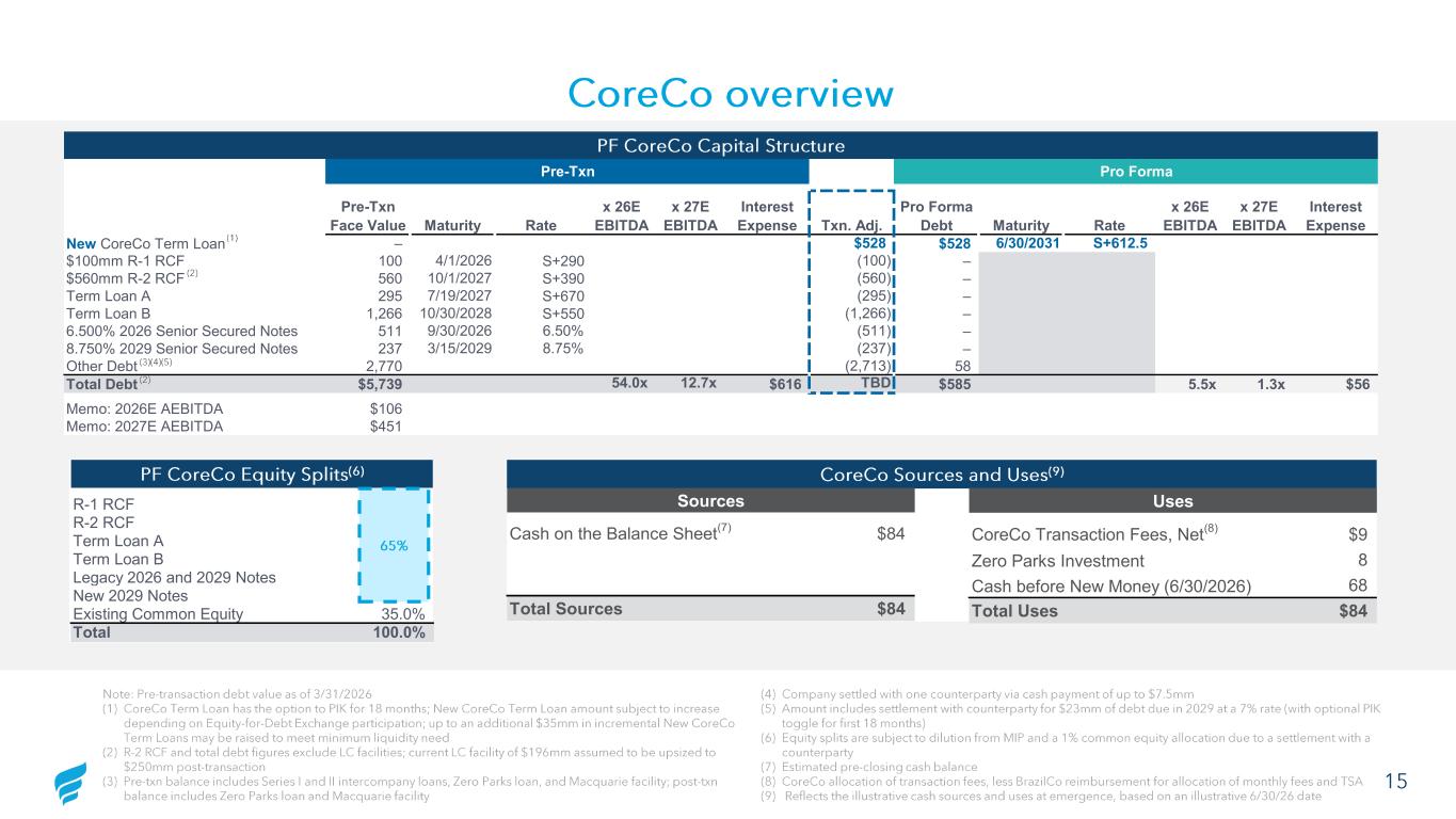 Pre-Txn Pro Forma Pre-Txn Face Value Maturity Rate x 26E EBITDA x 27E EBITDA Interest Expense Txn. Adj. Pro Forma Debt Maturity Rate x 26E EBITDA x 27E EBITDA Interest Expense New CoreCo Term Loan – $528 $528 6/30/2031 S+612.5 $100mm R-1 RCF 100 4/1/2026 S+290 (100) – $560mm R-2 RCF 560 10/1/2027 S+390 (560) – Term Loan A 295 7/19/2027 S+670 (295) – Term Loan B 1,266 10/30/2028 S+550 (1,266) – 6.500% 2026 Senior Secured Notes 511 9/30/2026 6.50% (511) – 8.750% 2029 Senior Secured Notes 237 3/15/2029 8.75% (237) – Other Debt 2,770 (2,713) 58 Total Debt $5,739 54.0x 12.7x $616 TBD $585 5.5x 1.3x $56 Memo: 2026E AEBITDA $106 Memo: 2027E AEBITDA $451 15 CoreCo overview PF CoreCo Capital Structure Note: Pre -transaction debt value as of 3/31/2026 (1) CoreCo Term Loan has the option to PIK for 18 months; New CoreCo Term Loan amount subject to increase depending on Equity -for-Debt Exchange participation; up to an additional $35mm in incremental New CoreCo Term Loans may be raised to meet minimum liquidity need (2) R-2 RCF and total debt figures exclude LC facilities; current LC facility of $196mm assumed to be upsized to $250mm post -transaction (3) Pre -txn balance includes Series I and II intercompany loans, Zero Parks loan, and Macquarie facility; post -txn balance includes Zero Parks loan and Macquarie facility (4) Company settled with one counterparty via cash payment of up to $7.5mm (5) Amount includes settlement with counterparty for $23mm of debt due in 2029 at a 7% rate (with optional PIK toggle for first 18 months) (6) Equity splits are subject to dilution from MIP and a 1% common equity allocation due to a settlement with a counterparty (7) Estimated pre -closing cash balance (8) CoreCo allocation of transaction fees, less BrazilCo reimbursement for allocation of monthly fees and TSA (9) Reflects the illustrative cash sources and uses at emergence, based on an illustrative 6/30/26 date PF CoreCo Equity Splits (6) R-1 RCF 1.4% R-2 RCF 9.1% Term Loan A 3.3% Term Loan B 18.4% Legacy 2026 and 2029 Notes 7.0% New 2029 Notes 25.8% Existing Common Equity 35.0% Total 100.0% CoreCo Sources and Uses (9) 65% (1) (2) (3)(4)(5) (2) Sources Cash on the Balance Sheet (7) $84 Total Sources $84 Uses CoreCo Transaction Fees, Net (8) $9 Zero Parks Investment 8 Cash before New Money (6/30/2026) 68 Total Uses $84