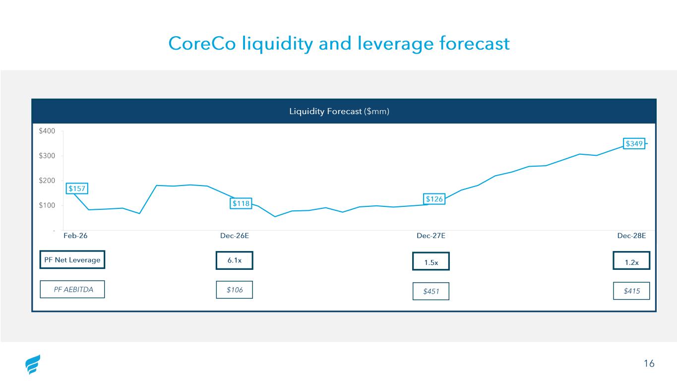 $157 $118 $126 $349 - $100 $200 $300 $400 16 Liquidity Forecast ($mm) PF Net Leverage 6.1x 1.5x 1.2x PF AEBITDA $106 $451 $415 CoreCo liquidity and leverage forecast Dec -26E Dec -27E Dec -28EFeb -26