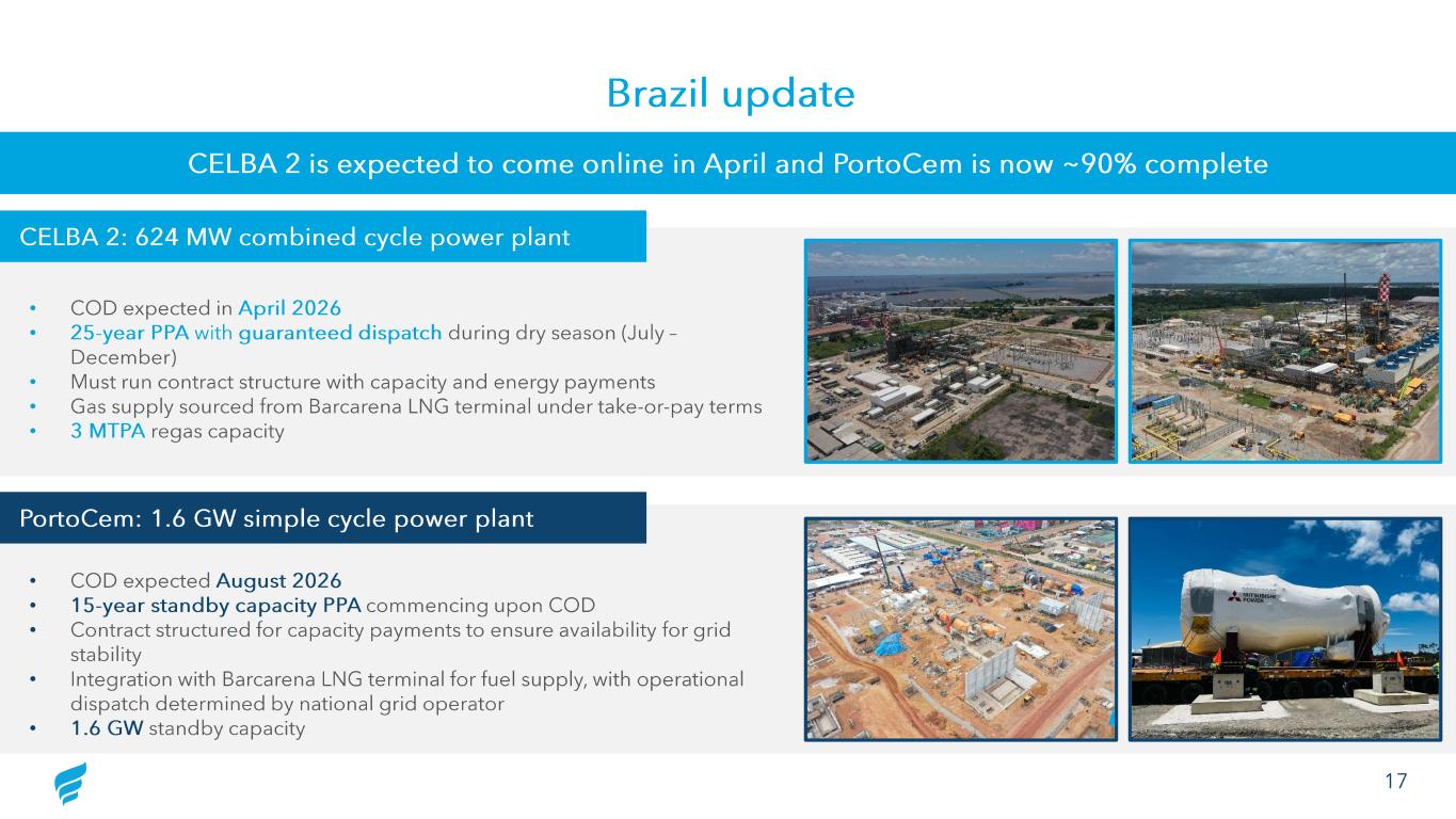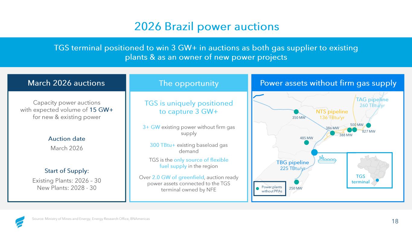 17 Brazil update CELBA 2 is expected to come online in April and PortoCem is now ~90% complete • COD expected in April 2026 • 25 -year PPA with guaranteed dispatch during dry season (July – December) • Must run contract structure with capacity and energy payments • Gas supply sourced from Barcarena LNG terminal under take -or-pay terms • 3 MTPA regas capacity CELBA 2: 624 MW combined cycle power plant • COD expected August 2026 • 15 -year standby capacity PPA commencing upon COD • Contract structured for capacity payments to ensure availability for grid stability • Integration with Barcarena LNG terminal for fuel supply, with operational dispatch determined by national grid operator • 1.6 GW standby capacity PortoCem: 1.6 GW simple cycle power plant