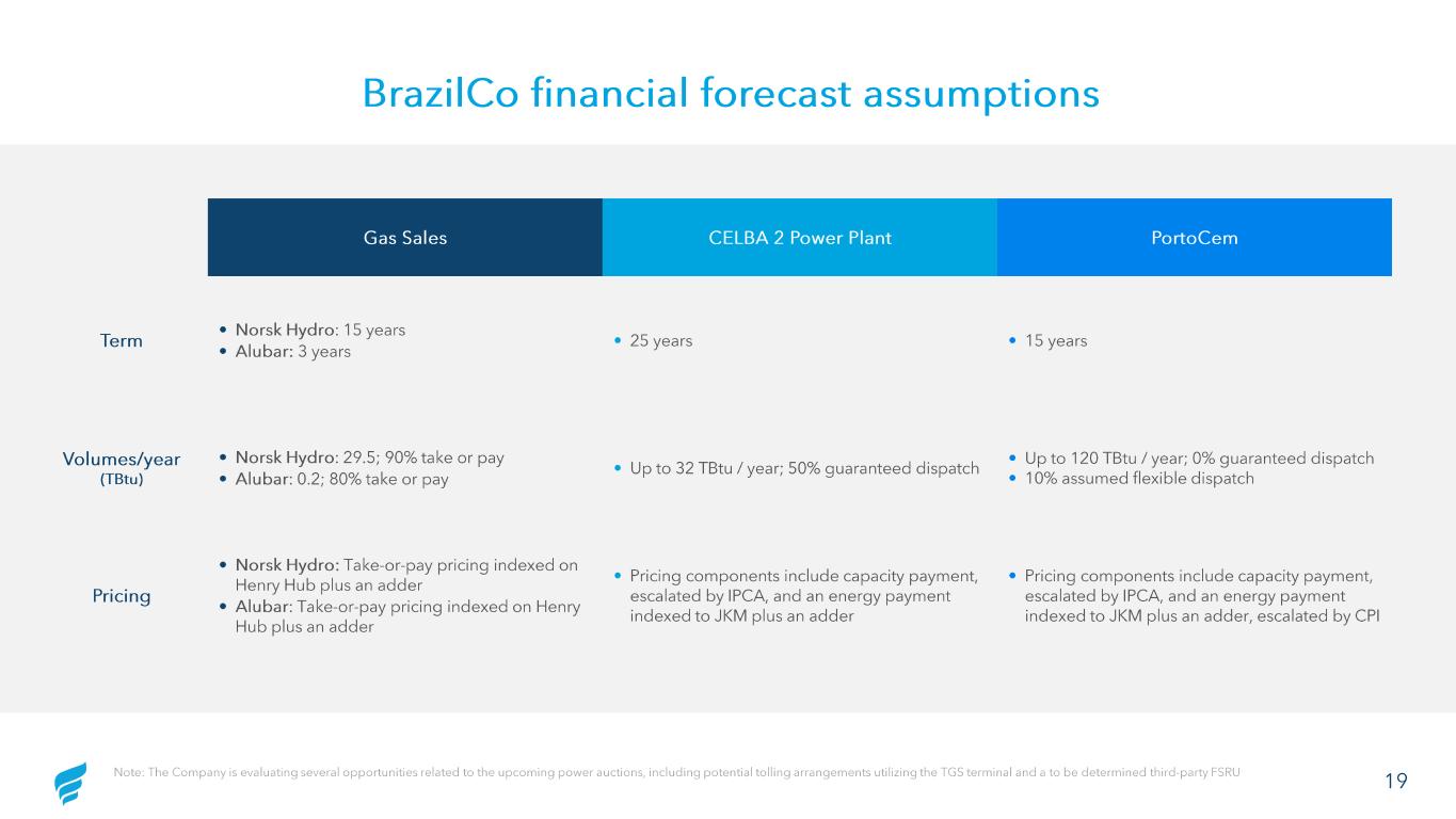 18 Source: Ministry of Mines and Energy, Energy Research Office, BNAmericas 2026 Brazil power auctions TGS terminal positioned to win 3 GW+ in auctions as both gas supplier to existing plants & as an owner of new power projects March 2026 auctions Capacity power auctions with expected volume of 15 GW+ for new & existing power Auction date March 2026 Start of Supply: Existing Plants: 2026 – 30 New Plants: 2028 - 30 The opportunity 3+ GW existing power without firm gas supply 300 TBtu + existing baseload gas demand TGS is uniquely positioned to capture 3 GW+ TGS is the only source of flexible fuel supply in the region Over 2.0 GW of greenfield , auction ready power assets connected to the TGS terminal owned by NFE Power assets without firm gas supply TBG pipeline 225 TBtu/yr TAG pipeline 260 TBtu /yr NTS pipeline 136 TBtu /yr 485 MW 386 MW 827 MW 500 MW 250 MW 350 MW 388 MW TGS terminal Power plants without PPAs