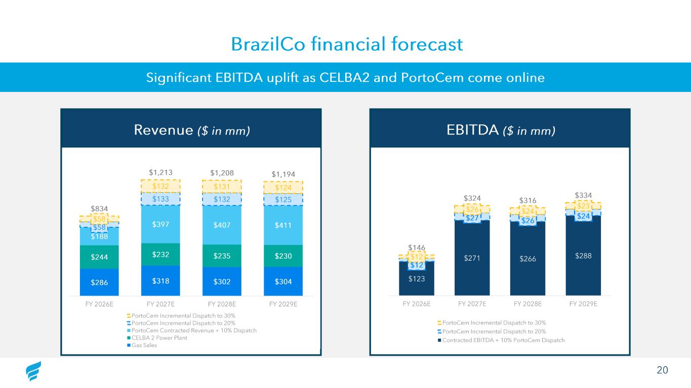 19 Note: The Company is evaluating several opportunities related to the upcoming power auctions, including potential tolling arr ang ements utilizing the TGS terminal and a to be determined third -party FSRU BrazilCo financial forecast assumptions Gas Sales CELBA 2 Power Plant PortoCem Term • Norsk Hydro : 15 years • Alubar : 3 years • 25 years • 15 years Volumes/year (TBtu ) • Norsk Hydro : 29.5 ; 90% take or pay • Alubar : 0.2 ; 80% take or pay • Up to 32 TBtu / year; 50% guaranteed dispatch • Up to 120 TBtu / year; 0% guaranteed dispatch • 10% assumed flex ible dispatch Pricing • Norsk Hydro: Take -or-pay pricing indexed on Henry Hub plus an adder • Alubar : Take -or-pay pricing indexed on Henry Hub plus an adder • Pricing components include capacity payment, escalated by IPCA, and an energy payment indexed to JKM plus an adder • Pricing components include capacity payment, escalated by IPCA, and an energy payment indexed to JKM plus an adder, escalated by CPI