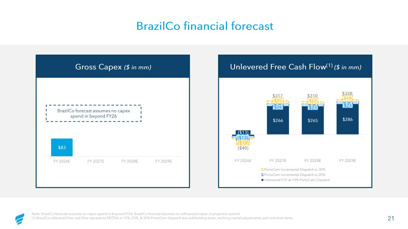 20 BrazilCo financial forecast Significant EBITDA uplift as CELBA2 and PortoCem come online Revenue ($ in mm) $286 $318 $302 $304 $244 $232 $235 $230 $188 $397 $407 $411 - - - $58 $133 $132 $125 $58 $132 $131 $124 $834 $1,213 $1,208 $1,194 FY 2026E FY 2027E FY 2028E FY 2029E PortoCem Incremental Dispatch to 30% PortoCem Incremental Dispatch to 20% PortoCem Contracted Revenue + 10% Dispatch CELBA 2 Power Plant Gas Sales EBITDA ($ in mm) $123 $271 $266 $288 - - - $12 $27 $26 $24 $12 $26 $24 $23 $146 $324 $316 $334 FY 2026E FY 2027E FY 2028E FY 2029E PortoCem Incremental Dispatch to 30% PortoCem Incremental Dispatch to 20% Contracted EBITDA + 10% PortoCem Dispatch