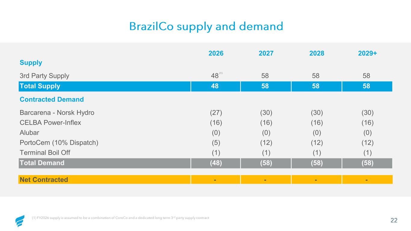 21 Note: BrazilCo forecast assumes no capex spend in beyond FY26. BrazilCo forecast assumes no unfinanced capex in projection period (1) BrazilCo unlevered free cash flow represents EBITDA at 10%, 20%, & 30% PortoCem dispatch less withholding taxes, working capital adjustments, and one -time items BrazilCo financial forecast Gross Capex ($ in mm) $83 FY 2026E FY 2027E FY 2028E FY 2029E BrazilCo forecast assumes no capex spend in beyond FY26 ($13) $266 $265 $286 ($13) $26 $23 $23 ($14) $25 $22 $19 ($40) $317 $310 $328 FY 2026E FY 2027E FY 2028E FY 2029E PortoCem Incremental Dispatch to 30% PortoCem Incremental Dispatch to 20% Unlevered FCF at 10% PortoCem Dispatch Unlevered Free Cash Flow (1) ($ in mm)
