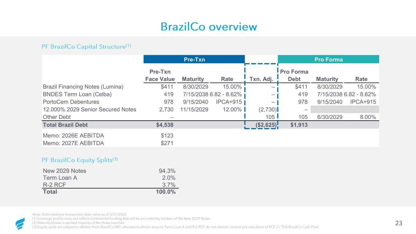 23 Note: Estimated pre -transaction debt value as of 3/31/2026 (1) Leverage profile does not reflect incremental funding that will be provided by holders of the New 2029 Notes (2) Maturity shown is earliest maturity of the three tranches (3) Equity splits are subject to dilution from BrazilCo MIP; allocations shown assume Term Loan A and R -2 RCF do not elect to receive pro rata share of RCF -2 / TLA BrazilCo Cash Pool BrazilCo overview PF BrazilCo Equity Splits (3) PF BrazilCo Capital Structure (1) New 2029 Notes 94.3% Term Loan A 2.0% R-2 RCF 3.7% Total 100.0% (2) Pre-Txn Pro FormaV Pre-Txn Face Value Maturity Rate Txn. Adj. Pro Forma Debt Maturity Rate Brazil Financing Notes (Lumina) $411 8/30/2029 15.00% – $411 8/30/2029 15.00% BNDES Term Loan (Celba) 419 7/15/2038 6.82 - 8.62% – 419 7/15/2038 6.82 - 8.62% PortoCem Debentures 978 9/15/2040 IPCA+915 – 978 9/15/2040 IPCA+915 12.000% 2029 Senior Secured Notes 2,730 11/15/2029 12.00% (2,730) – Other Debt – 105 105 6/30/2029 8.00% Total Brazil Debt $4,538 ($2,625) $1,913 Memo: 2026E AEBITDA $123 Memo: 2027E AEBITDA $271