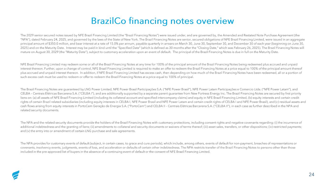 BrazilCo financing notes overview The 2029 senior secured notes issued by NFE Brazil Financing Limited (the “Brazil Financing Notes”) were issued under, and ar e g overned by, the Amended and Restated Note Purchase Agreement (the “NPA”), dated February 24, 2025, and governed by the laws of the State of New York. The Brazil Financing Notes are senior, se cur ed obligations of NFE Brazil Financing Limited, were issued in an aggregate principal amount of $350.0 million, and bear interest at a rate of 15.0% per annum, payable quarterly in arrears on March 30, Ju ne 30, September 30, and December 30 of each year (beginning on June 30, 2025) and on the Maturity Date. Interest may be paid in kind until the “Specified Date” (which is defined as 30 months after the “Closing Date,” which was February 26, 2025). The Brazil Financing Notes will mature on August 30, 2029 (the “Maturity Date”), subject to customary acceleration upon an event of default. The principal o f the Brazil Financing Notes is due in full on the Maturity Date. NFE Brazil Financing Limited may redeem some or all of the Brazil Financing Notes at any time for 100% of the principal amoun t of the Brazil Financing Notes being redeemed plus accrued and unpaid interest thereon. Further, upon a change of control, NFE Brazil Financing Limited is required to make an offer to redeem the Bra zil Financing Notes at a price equal to 100% of the principal amount thereof plus accrued and unpaid interest thereon. In addition, if NFE Brazil Financing Limited has excess cash, then depending on ho w m uch of the Brazil Financing Notes have been redeemed, all or a portion of such excess cash must be used to redeem or offer to redeem the Brazil Financing Notes at a price equal to 100% of principal. The Brazil Financing Notes are guaranteed by LNG Power Limited, NFE Power Brasil Participações S.A. (“NFE Power Brasil ”), NFE Power Latam Participações e Comercio Ltda. (“NFE Power Latam”), and CELBA – Centrais Elétricas Barcarena S.A. (“CELBA I”), and are additionally supported by a separate parent guarantee from New Fortress Energy Inc. The Brazil Fina nc ing Notes are secured by first priority liens on: (a) all assets of NFE Brazil Financing Limited (including its collateral account and specified intercompany claims) an d equity in NFE Brazil Financing Limited, (b) equity interests and certain credit rights of certain Brazil related subsidiaries (including equity interests in CELBA I, NFE Power Brasil and NFE Power Latam and certain credit rights of CELBA I and NFE Power Brasil ), and (c) residual assets and cash flows arising from equity interests in PortoCem Geração de Energia S.A. (“ PortoCem ”) and CELBA II – Centrais Elétricas Barcarena S.A. (“CELBA II”), in each case as further described in the NPA and related security documents. The NPA and the related security documents provide the holders of the Brazil Financing Notes with customary protections, incl udi ng consent rights and negative covenants regarding: ( i) the incurrence of additional indebtedness and the granting of liens; (ii) amendments to collateral and security documents or waivers of terms t her eof; (iii) asset sales, transfers, or other dispositions; (iv) restricted payments; and (v) the entry into or amendment of certain LNG purchase and sale agreements. The NPA provides for customary events of default (subject, in certain cases, to grace and cure periods), which include, among others, events of default for non -payment, breaches of representations or covenants, insolvency events, judgments, events of loss, and acceleration or defaults of certain other indebtedness. The NPA res tricts transfer of the Brazil Financing Notes to persons other than those included in the pre -approved list of buyers in the absence of a continuing event of default or the consent of NFE Brazil Financi ng Limited. 24